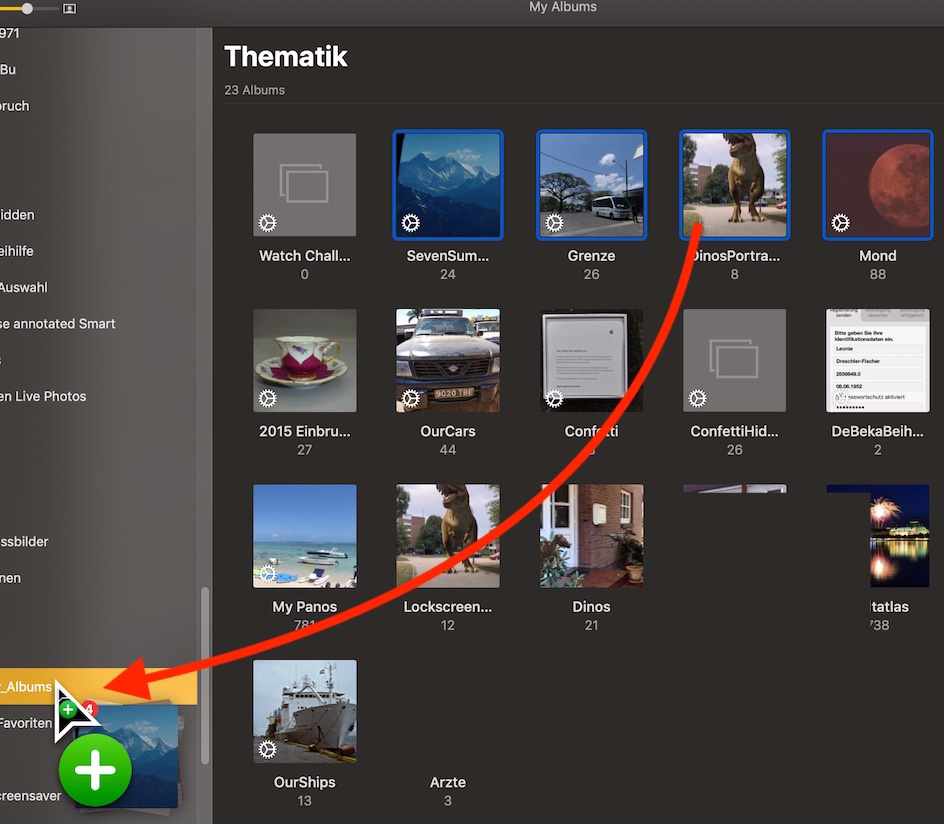 Dieses Foto zeigt, wie mit dem cursor ein Bereich um mehrere Alben ausgewählt wurde. Dies Alben können dann zusammen in einen Ordner in der Seitenleiste gezogen werden.