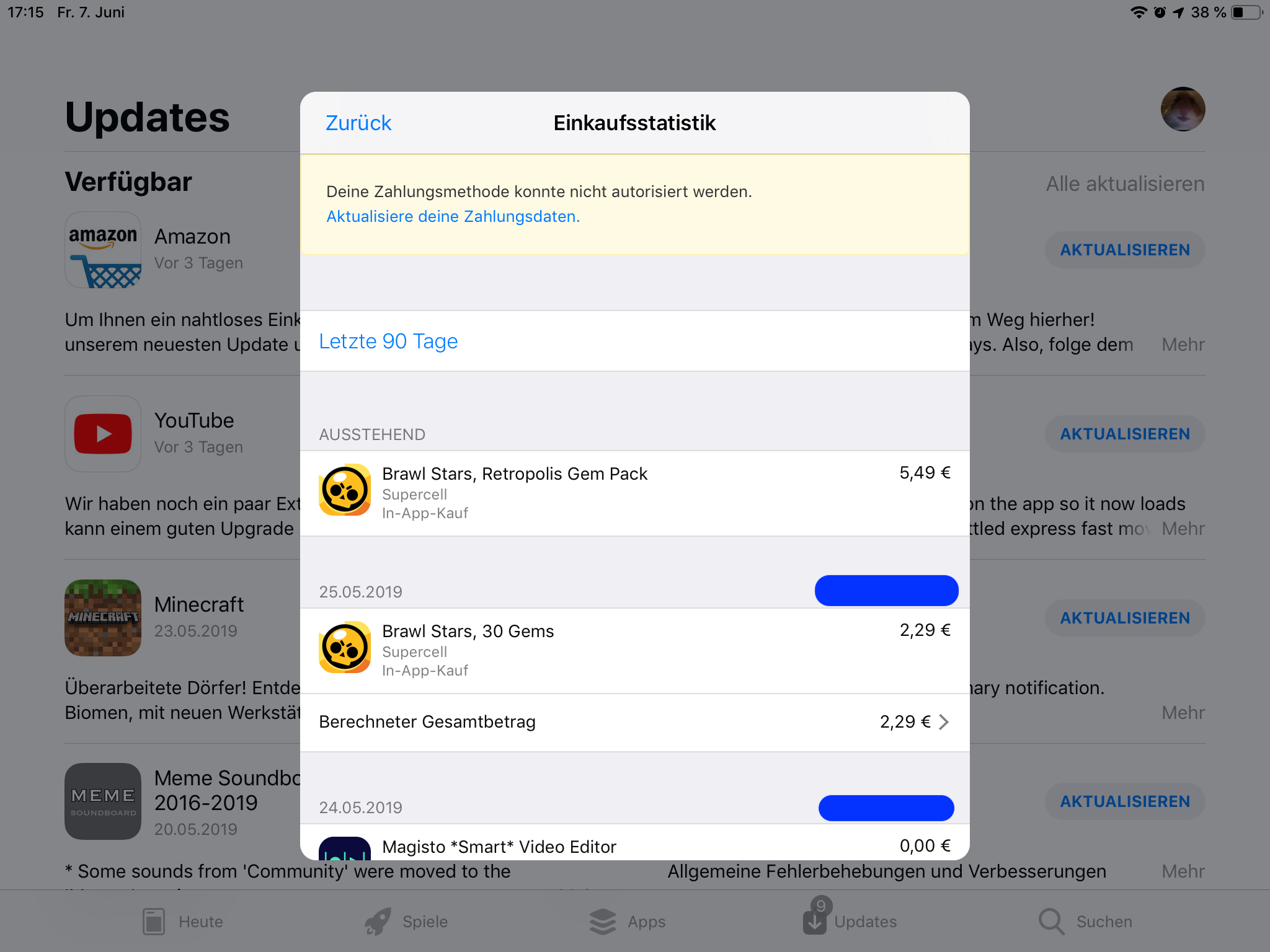 Ich kann seit neustem keine Einkäufe/downloads mehr machen. Ich hab in meine Einkaufsstatistik geguckt und da stand „Ausstehender Kauf“ ich wollte es entfernen aber es geht nicht, ich hab auch kein Bock wegen das jetzt 5€ mehr auszugeben, wie kann ich das beheben? (Ich benutze die Handyrechnung für Einkäufe