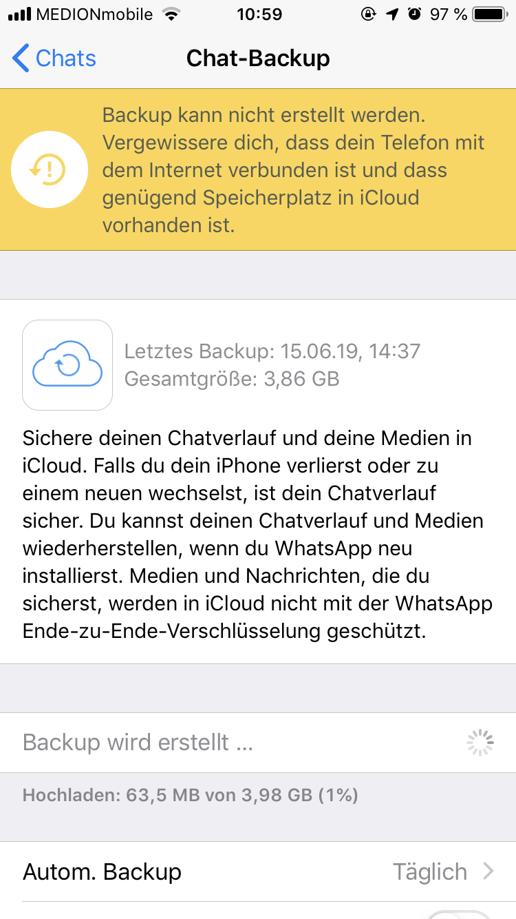 Trotz ausreichend Speicher, WhatsApp-Backup funktioniert nicht