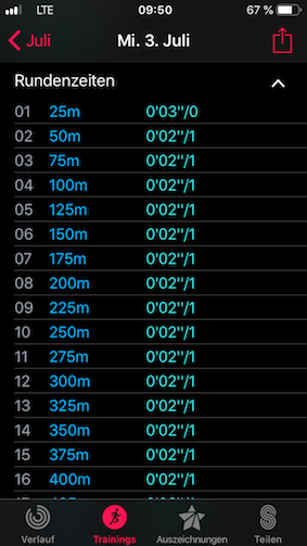 In dieser Zeit stimmen weder die aufgezeichneten Strecken (Schwimmen über Land) noch noch die Rundenzeiten. Außerdem scheinen Start- und Endpunkt mitten auf dem See zu liegen.