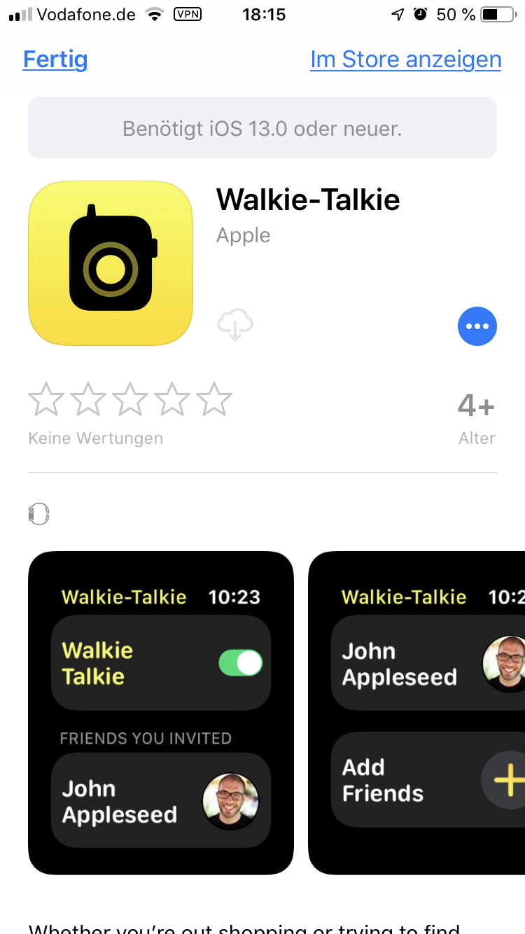 Ich habe ein iPhone 8 und Eine apple watch . Nun wollte ein Freund mit mir Walkie-Talkie . Dabei haben wir fest gestellt das ich die App nicht auf meiner Apple Produkte habe . Dann habe ich bei Dienstprogramme geguckt dort zeigt man mir das das Handy Software 13. oder mehr haben muss . Meine Freund haben i phone x und Apple Watch 2 . Warum bekomme ich das nicht. Können Sie mir helfen .