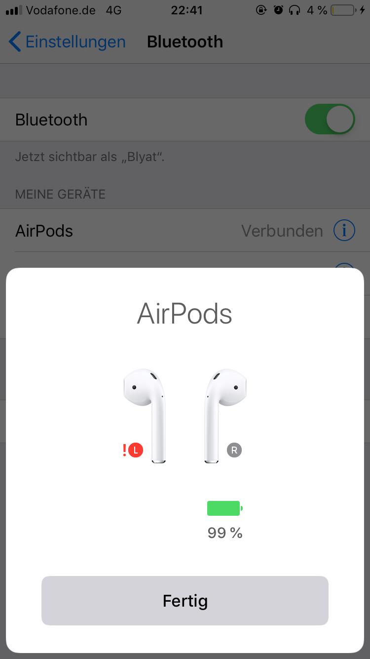 Ich habe ein Problem mit meinem linken AirPod dieser funktioniert nicht mehr. Habe im Internet schon alles durchsucht alles probiert (an und aus, voll aufgeladen) nichts hat geholfen er funktioniert seit ca 4 tagen nicht mehr und ich weiß nicht was ich noch machen könnte. Ich würde mich über eine Hilfreiche Antwort erfreuen. Danke!