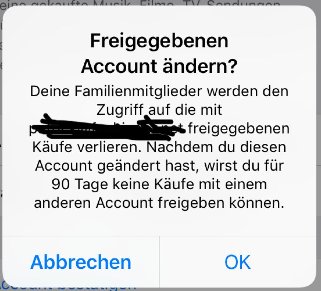 mich habe gemerkt, dass in der Familienfreigabe beim Account meiner Frau (eingetragen als Erziehungsberechtigte) mein iCloud-Account für iTunes und App-Store hinterlegt ist. Wenn ich den Account auf den iCloud-Account meiner Frau ändern möchte kommt die Warnung dass alle Käufe die über meinen Account erfolgt sind den restlichen Familienmitgliedern nicht mehr zur Verfügung stehen und das ganze erst in 90 Tagen wieder geändert werden kann. Gilt das auch wenn mein Account bei mir noch eingetragen ist, also die Freigabe weiterhin erteilt ist?