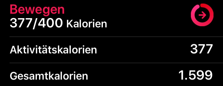 Am ende des Trainings habe ich mir dann die Einzelheiten in der Iphone-Aktivitätsapp angesehen und folgendes festgestellt: Die Aktivitätskalorien sind nicht das gleiche wie die Gesamtkalorien!