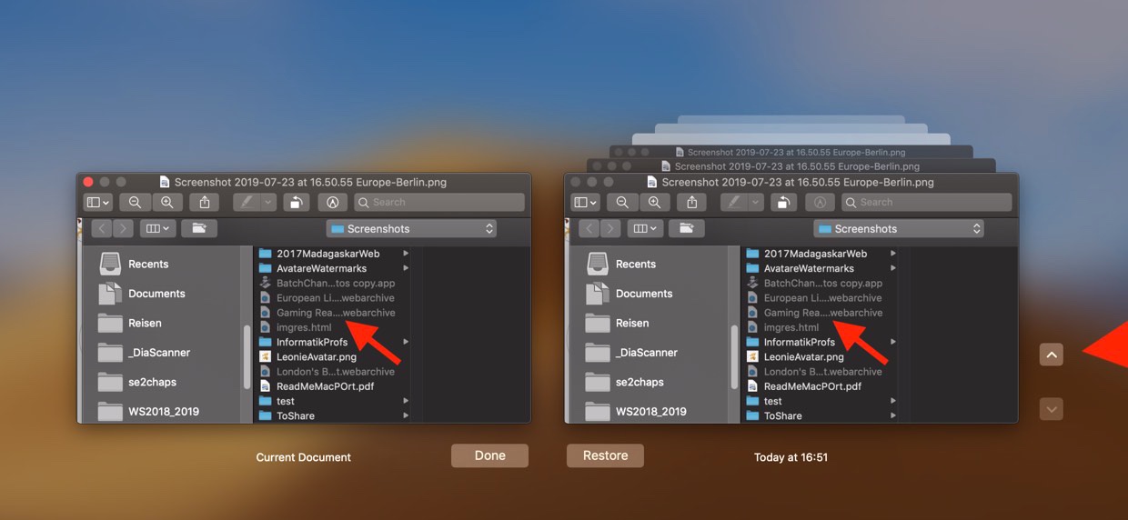 Ich habe versuchsweise mal in ein Bildschirmfoto einen Pfeil eingefügt und das Bild dann gesichert. Nachdem ich es wieder geöffnet habe, konnte ich mit "File > Revert to > browse all Versions" alle vorherigen Versionen anzeigen lassen. Auf einer deutschen Version müsste das entsprechende Kommando im Menü "Ablage" sein:
