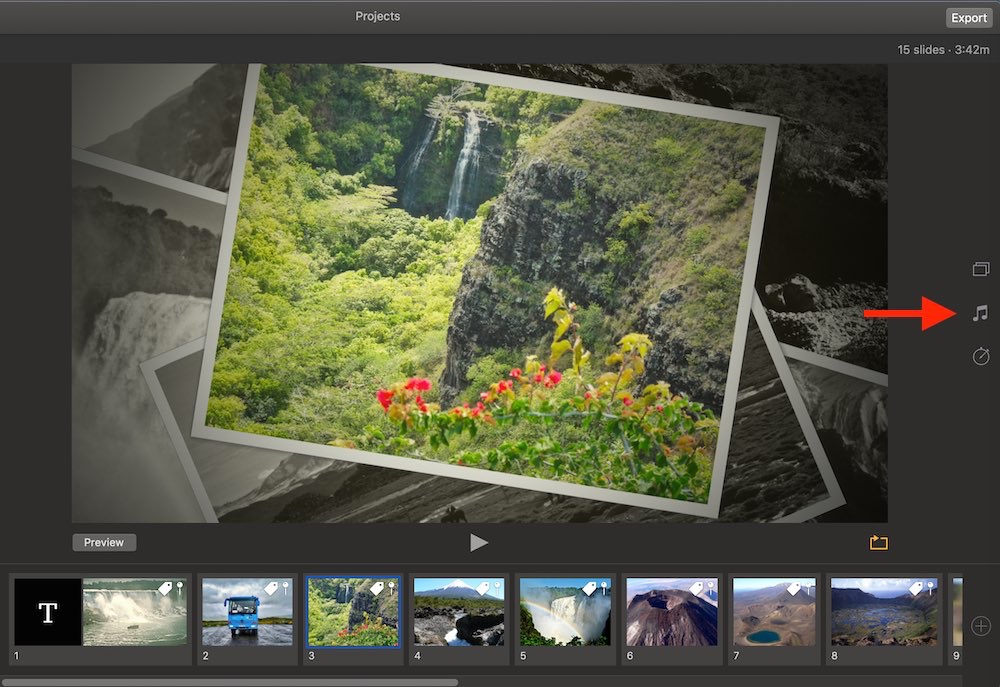 When you create a slideshow project, look for the options at the right border of the Photos window. You may need to enlarge the widow by dragging a corner, if it is too small.