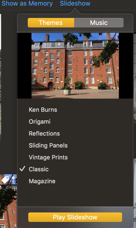 For an instant slideshow, played directly from an album, you should be seeing a drop-down panel, when you click "Slideshow", where you can change the theme and the music: