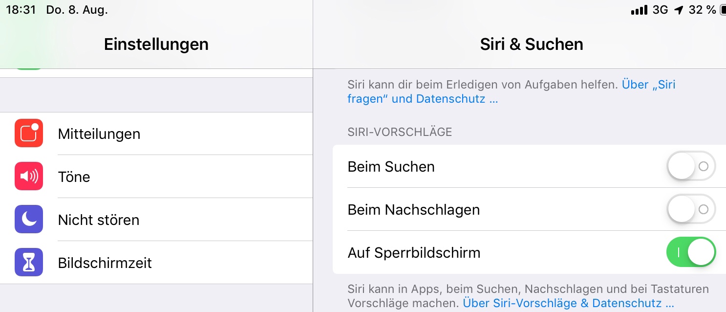 Abgesehen davon, dass mir die Vorschläge auf dem Sperrbildschirm tierisch auf die Nerven gehen, will nicht dass mein Verhalten durch Siri ausgewertet wird. Also will ich es komplett deaktivieren. Wie kann ich das tun? Danke im Voraus.