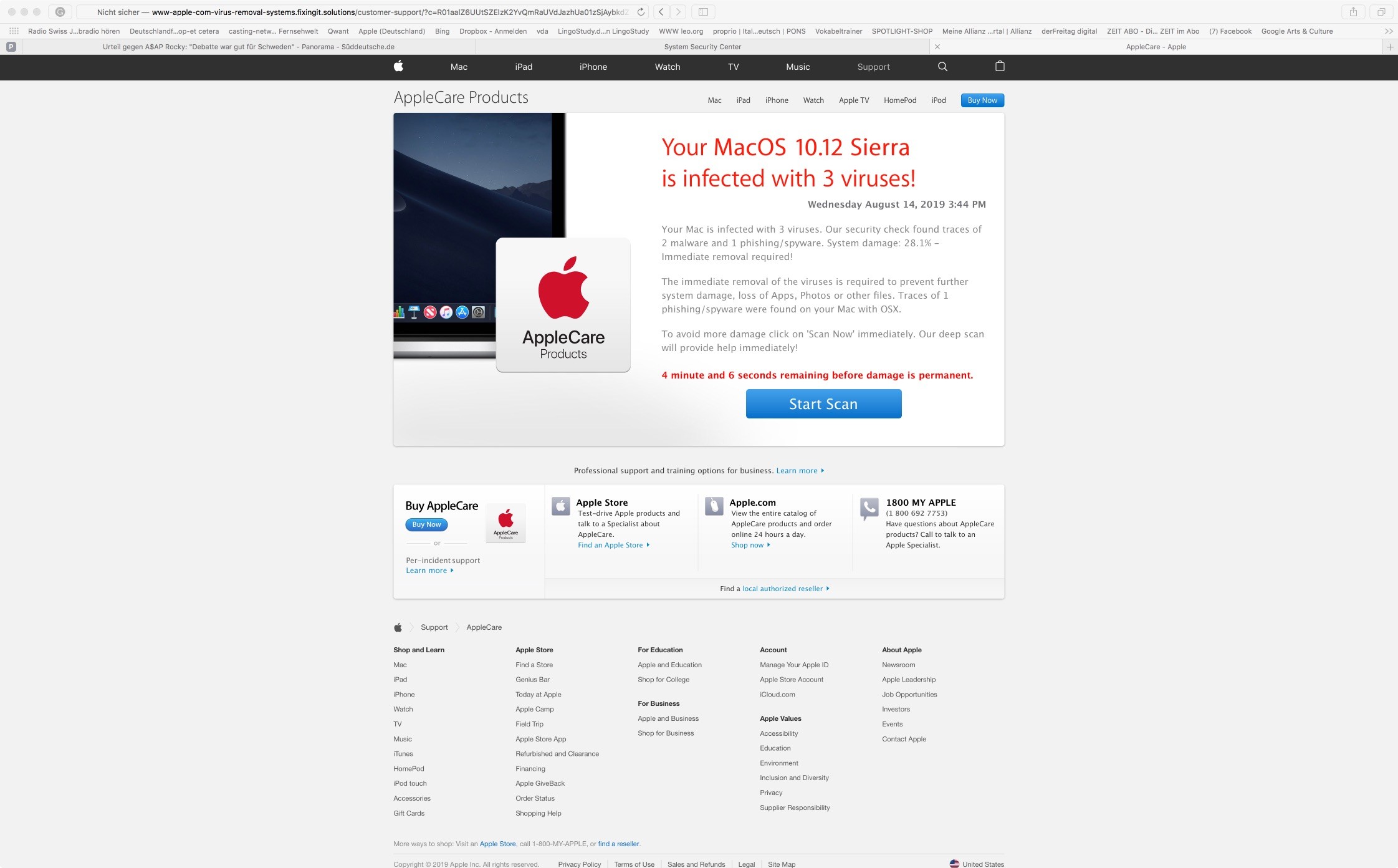 Ich benutze den Browser Safari. Egal was für eine Internetseite ich aufsuche, zeigt mir der Computer erst ein Bild "Wir haben einen Trojaner Virus auf Ihrem Mac erkannt. Dann kommt eine angebliche Apple Seiteund schließlich öffnet sich eine Seite von MacKeeper. Inzwischen spricht auf diesen Seiten auch eine Computerstimme. Das alles ist sehr lästig. Wie kann ich es abstellen? Habe bereits den Verlauf von Safari mehrfach vollständig gelöscht, was nichts bringt.
