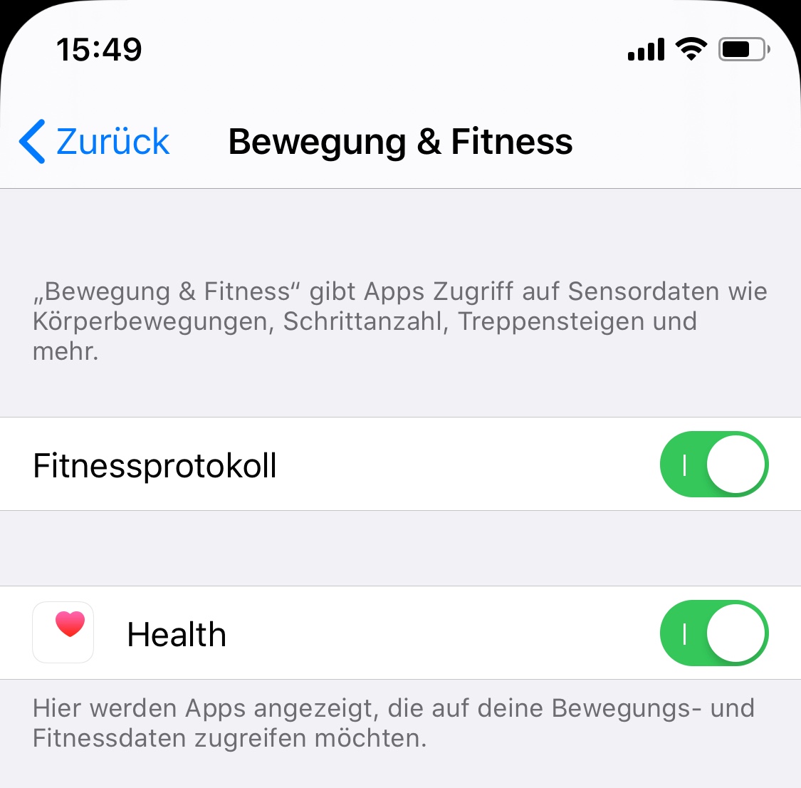 Nein, das war es nicht. Habe das Problem inzwischen beheben können. Einmal war in den Ortungsdiensteinstellungen die Bewegungskalibr./ Entfernung (siehe Bild 2) standardmäßig DEAKTIVIERT! Zweitens war die Einstellung Fitnessprotokoll ebenfalls standardmäßig deaktiviert (siehe Bild 1).