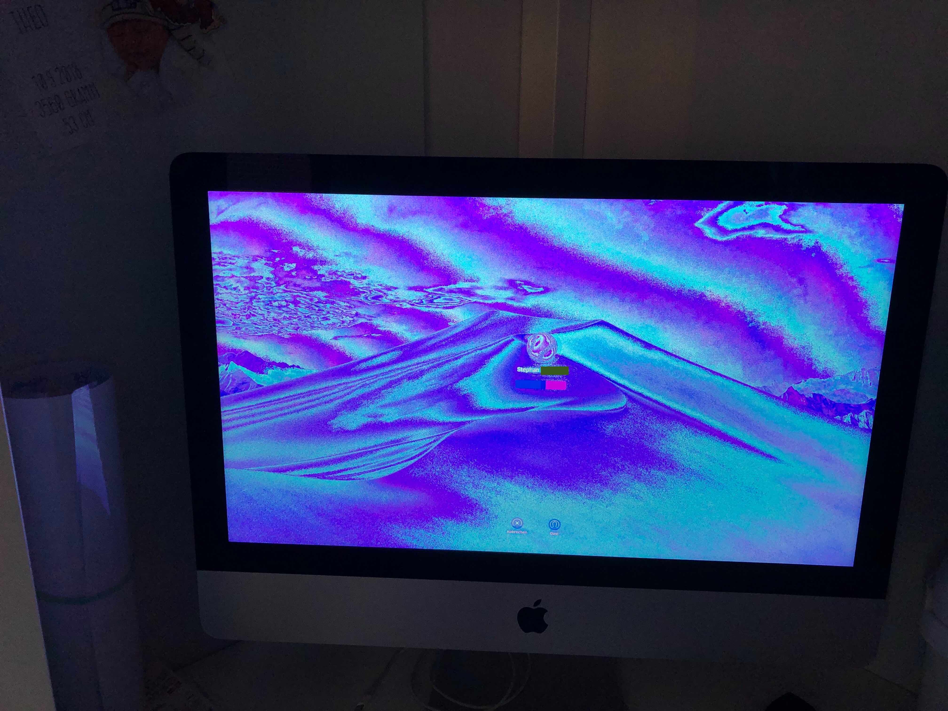 iMac wacht aus Ruhezustand auf und zeigt den Anmeldebildschirm in türkis/lila Tönen an
