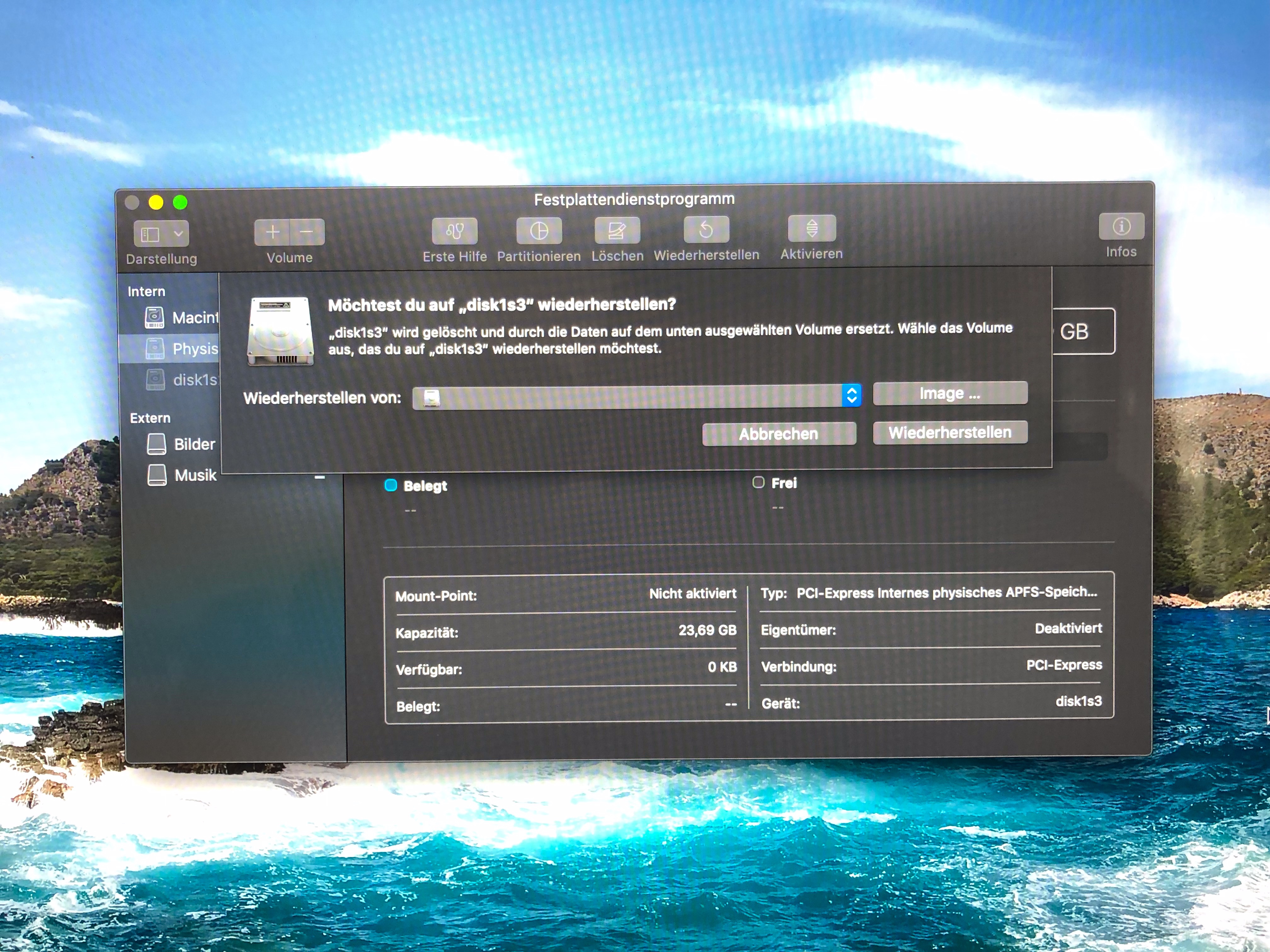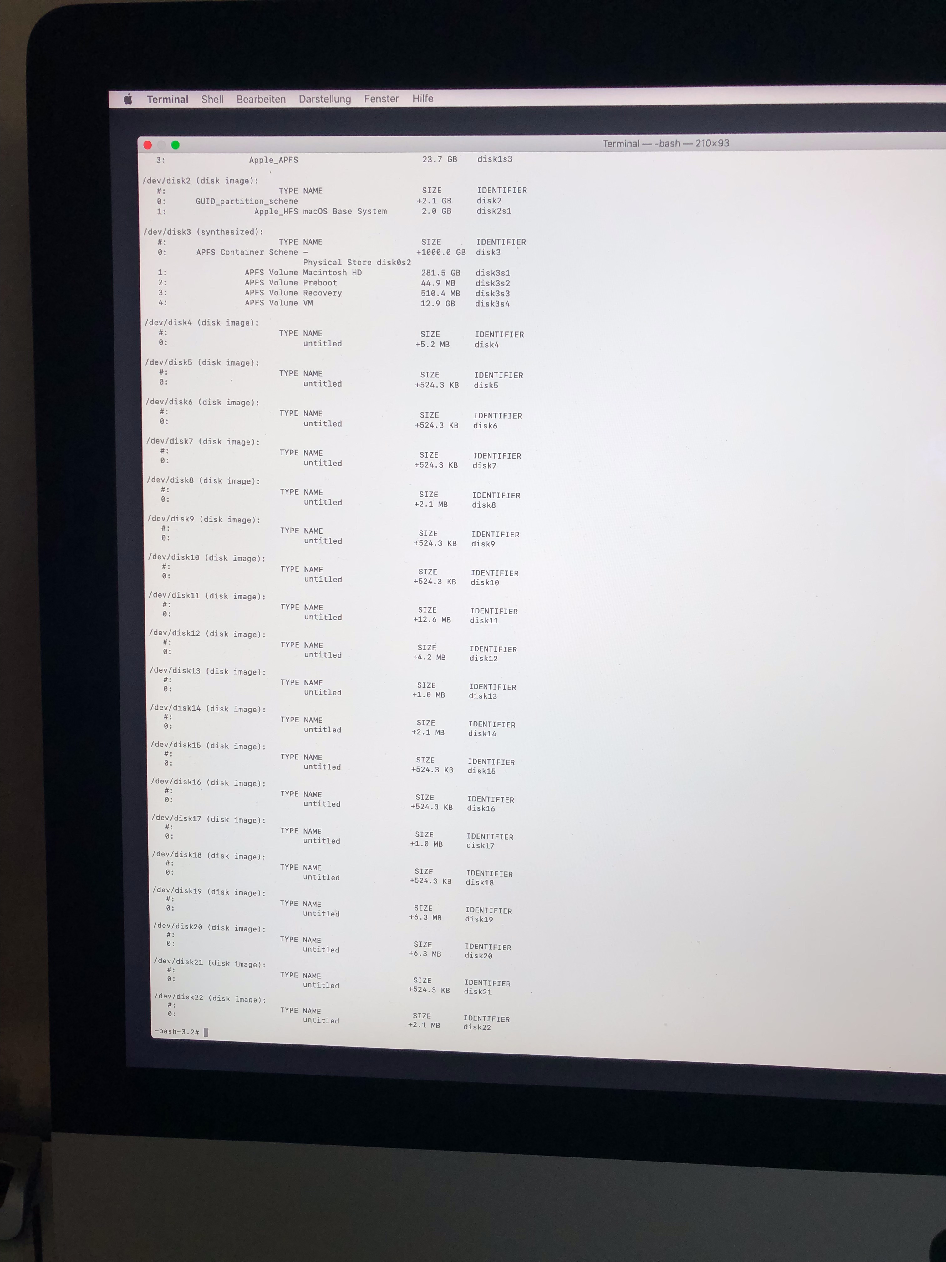 Als disk3 sieht man noch als external physical die 3TB externe Festplatte, die für Backups verwendet wird.