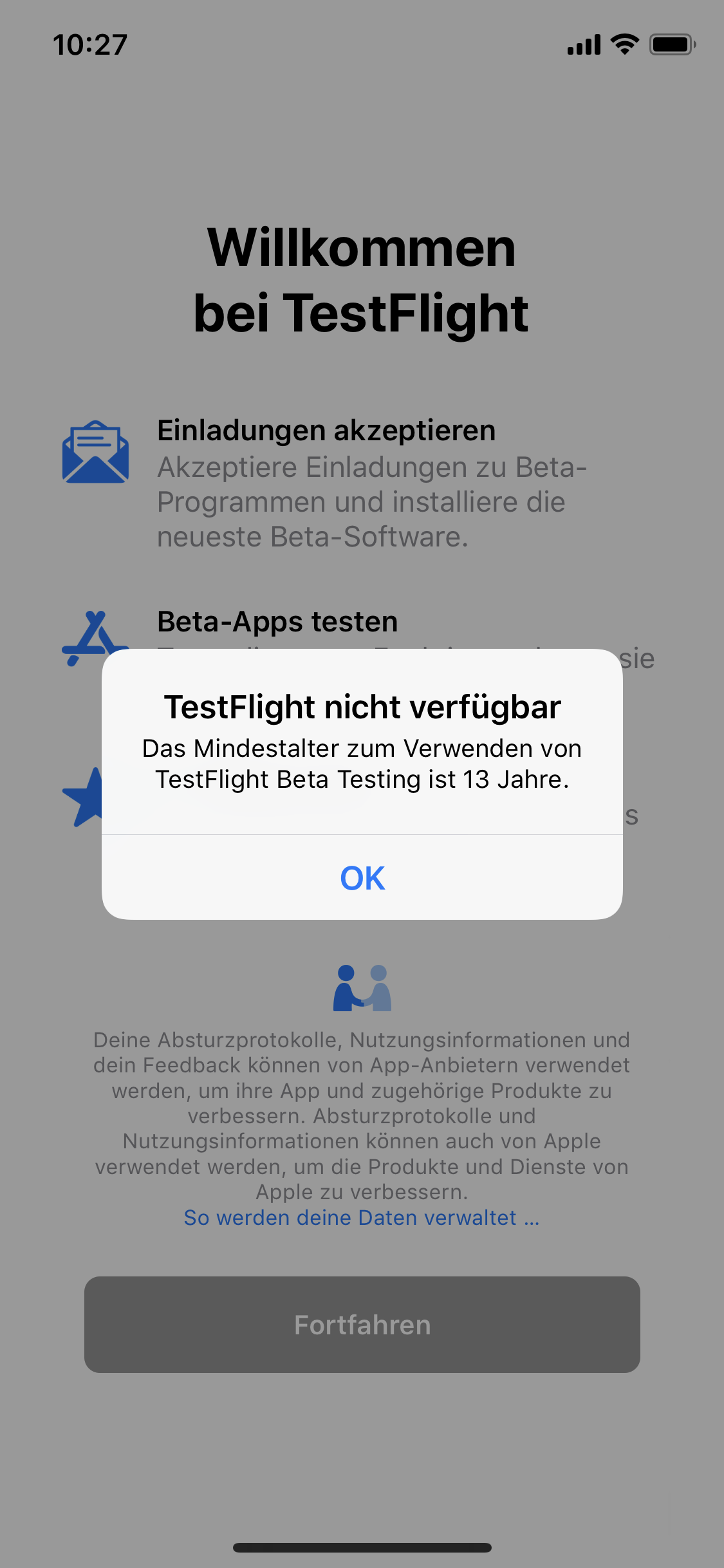 Hallo liebe Community ich habe ein Problem und zwar habe ich die TestFlight App aus dem App Store geladen und kann sie auch starten aber wenn ich sie starte und auf fortfahren will kommt eine Meldung (siehe unten)