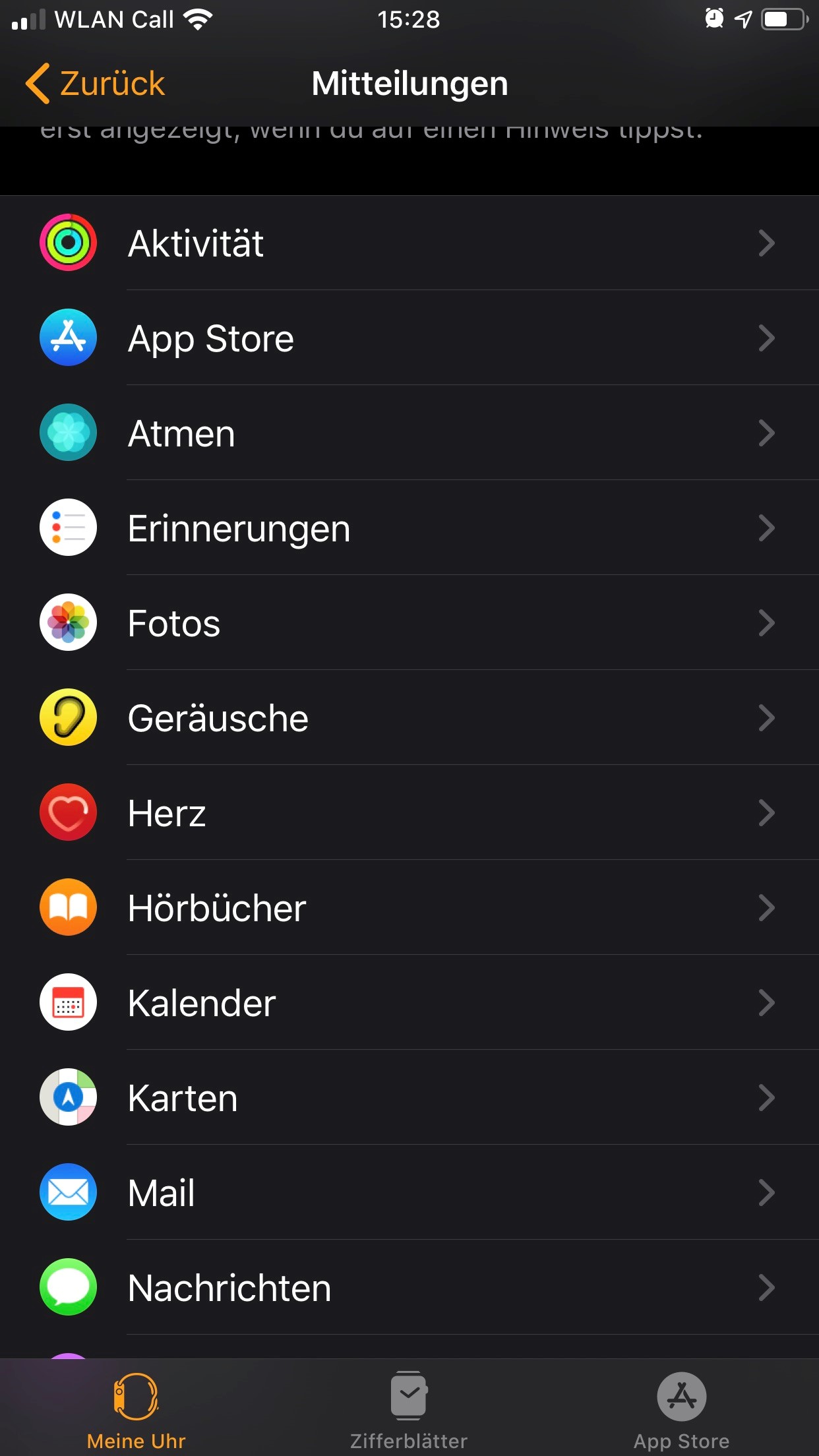 Um die Benachrichtigung auf der Apple Watch wieder zu bekommen müsste man nun in die Watch App auf dem iPhone gehen und dort in den Mitteilungseinstellungen die Benachrichtigungen für Bildschirmzeit wieder einschalten. Problem dabei: Bildschirmzeit Benachrichtigungen tauchen da gar nicht auf.