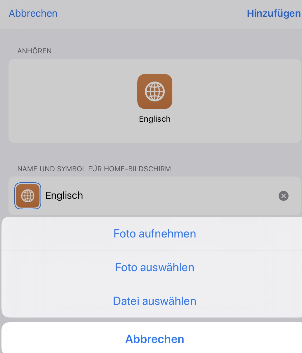 Man konnte und kann noch immer die auf Homebildschirme kopierten Kurzbefehle mit eigenen Photos versehen. Man drückt derzeit auf das Glyphen mit der blauen Umrandung und kann in Folge ein Bild aus der eigenen Auswahl anzeigen lassen.
