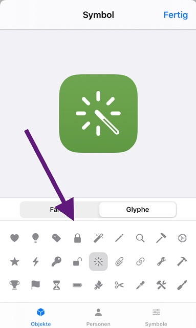 Zurück zum eigentlichen Thema: Beim Klick auf die blaue Umrandung kann, wie bereits gesagt, aus einer Vielzahl von Glyphen ausgewählt werden, die Apple zur Verfügung stellt (siehe beigefügten Screenshot). EIGENE Glyphen (wie z. B. ein Foto der Freundin oder des Freundes, eine Zeichnung des eigenen Kindes, ein selbsterstelltes Symbol wie etwa die ACDC-Hörnchen) können hingegen NICHT übernommen werden. Oder doch? Dann bitte mal einen aussagekräftigen Screenshot posten.