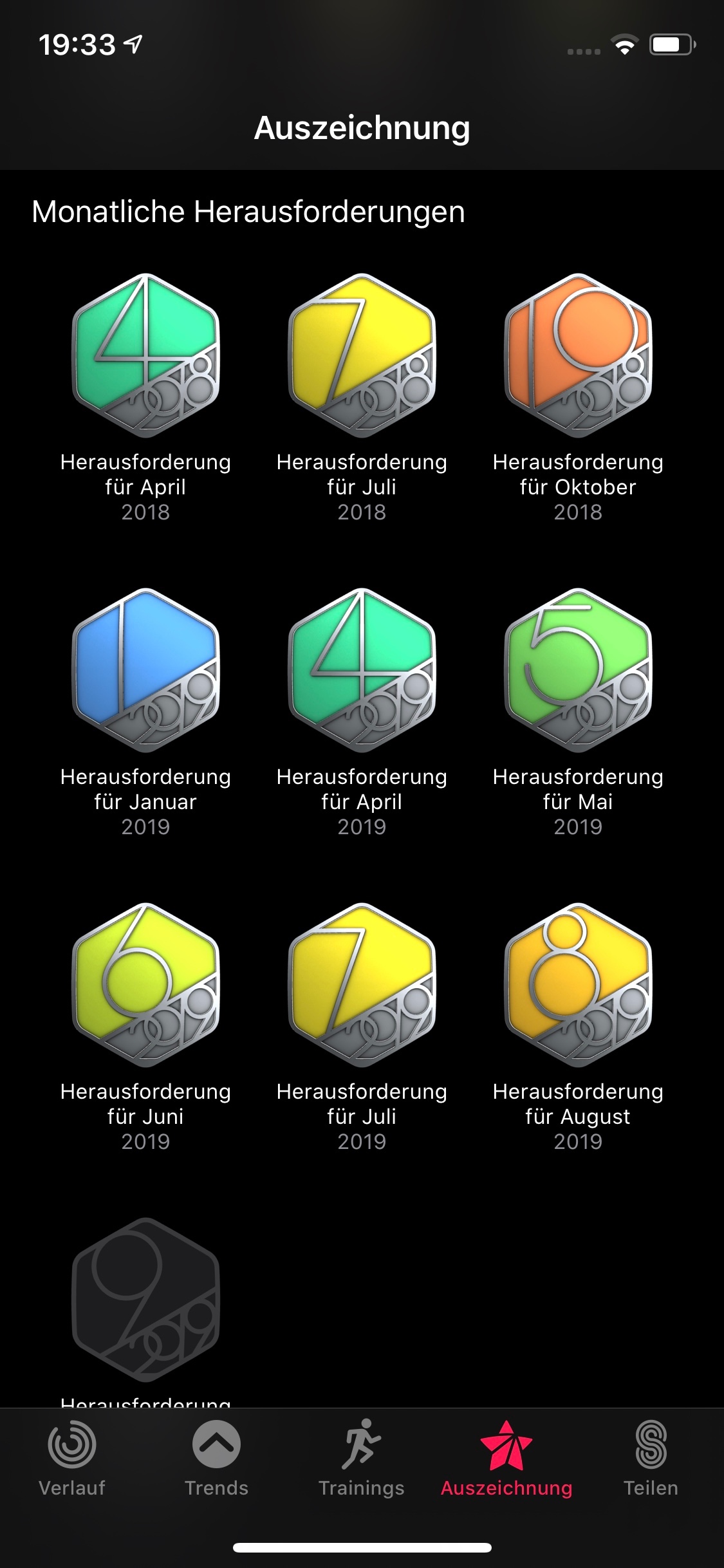 Die Auszeichnungen (Medaillen) sind jedoch lückenhaft. Genau gesagt: Es fehlen die Belohnungen für die monatlichen Herausforderungen seit Oktober 2018 (siehe Screenshots). Auch der Fortschritt für die aktuell laufende Aufgabe für September 2019 wird nicht angezeigt.