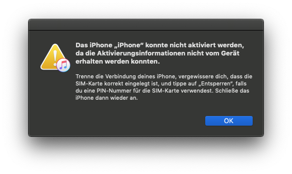 Nach dem Update meines iPhone 7 auf IOS 13 lässt sich das Gerät nicht mehr aktivieren und die SIM-Karte wird nicht mehr erkannt. Die SIM ist aber ok, da ich sie in einem anderen Gerät getestet habe. Ich bekomme beim Versuch, das iPhone zu aktivieren immer 2 Fehlermeldungen.