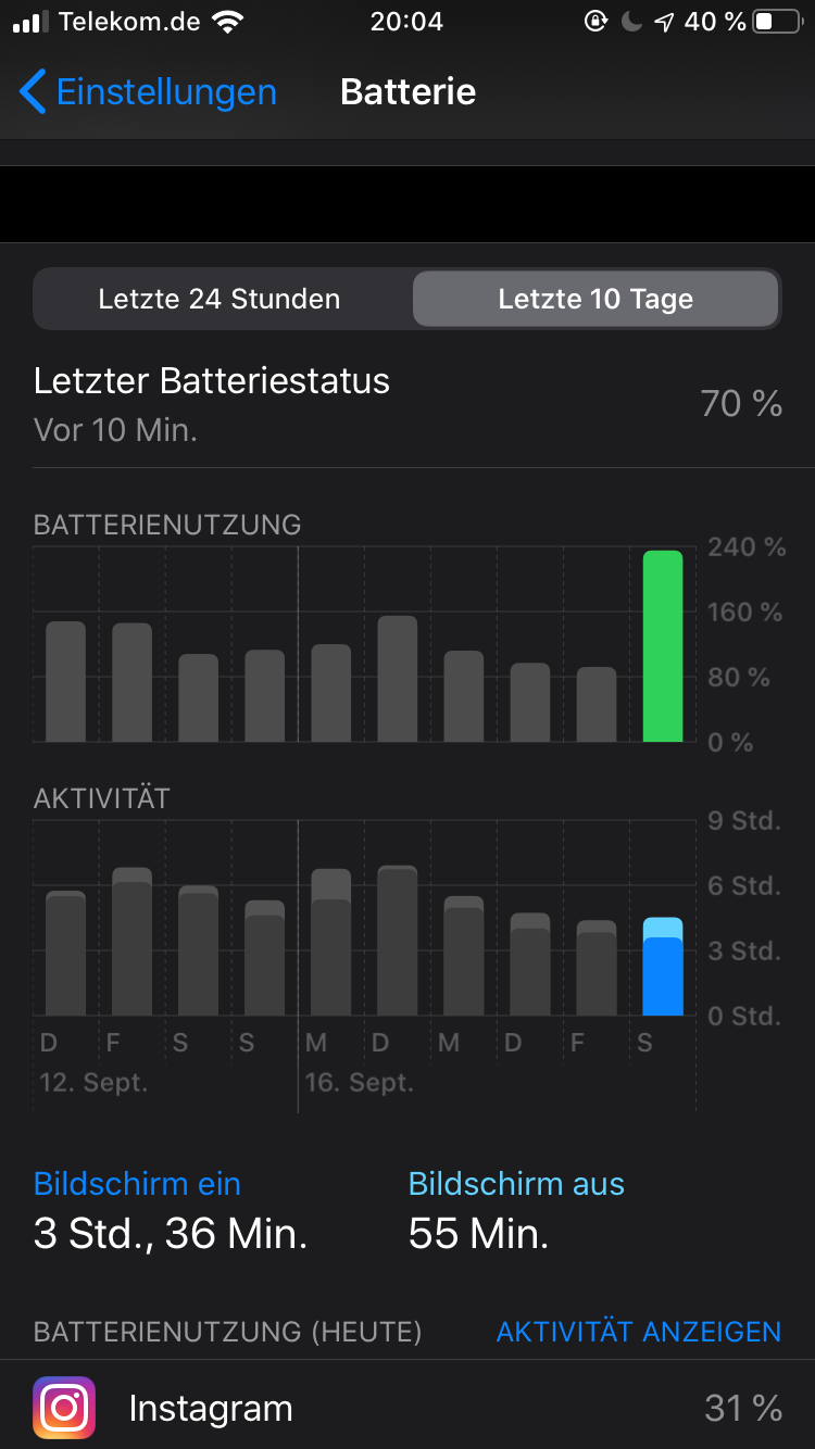 Nun meine Frage: Wie ist es möglich, dass ich durch das gestern durchgeführte Update auf iOS 13, bei weniger Nutzung 3x so viel Akku verbrauche? Ist es normal, dass ich teilweise innerhalb von 10 Minuten 30% des Akkus verbrauche?