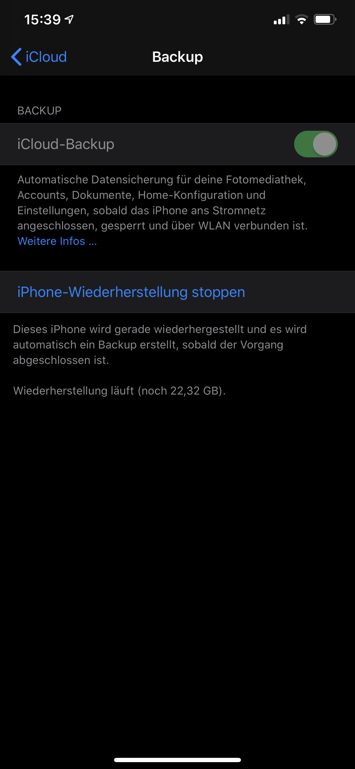 Hallo ich habe das iPhone 11pro Max gekauft und eine iCloud Backup Wiederherstellung durchgeführt. Leider bleibt die Wiederherstellung bei 20,34gb stehen das genau die Größe von meiner Galerie ist ich hab die Wiederherstellung abgebrochen und es erneut versucht doch wieder das selbe Problem die Fotos laden nicht auf mein iPhone ????