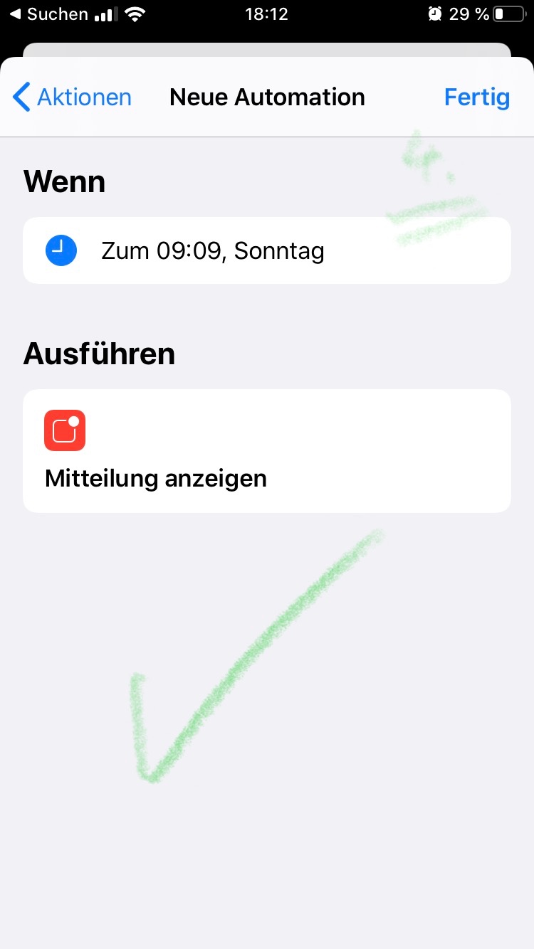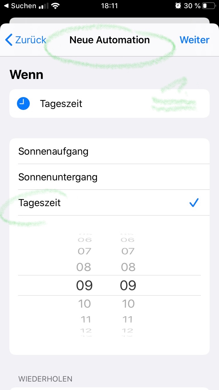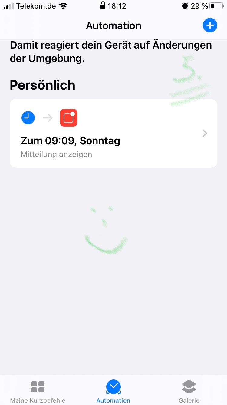 Noch einfacher dürfte es mit den ab iOS 13.1 verfügbaren Automationen gehen. Einfach mal neben „Meine Kurzbefehle“ auf „Automation“ klicken, dann auf „Persönliche Automation erstellen“ und dann den ersten Vorschlag unterhalb der Überschrift „Ereignisse“ ansehen: Tageszeit, z. B. „Um 8 Uhr an Wochentagen“