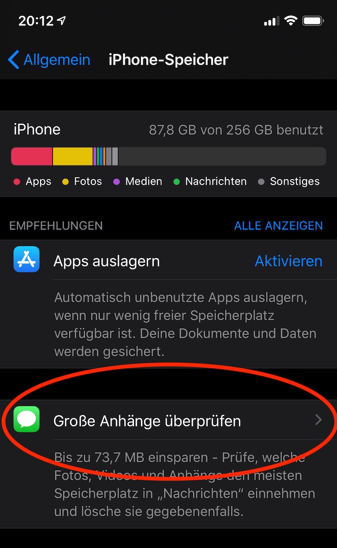 Einstellungen --> Allgemein --> iPhone-Speicher --> Große Anhänge überprüfen