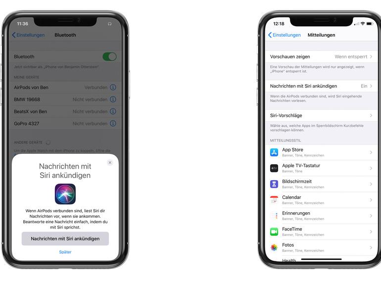 Alternativ dazu können Sie auch die Einstellungen aufrufen und „Mitteilungen“ auswählen. Dort finden Sie gleich als zweiten Eintrag „Nachrichten mit Siri ankündigen“. Darin können Sie Funktionen jederzeit de-/aktivieren.