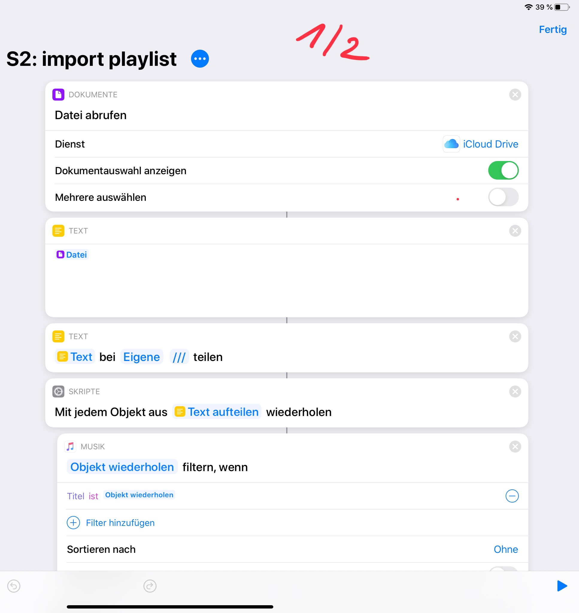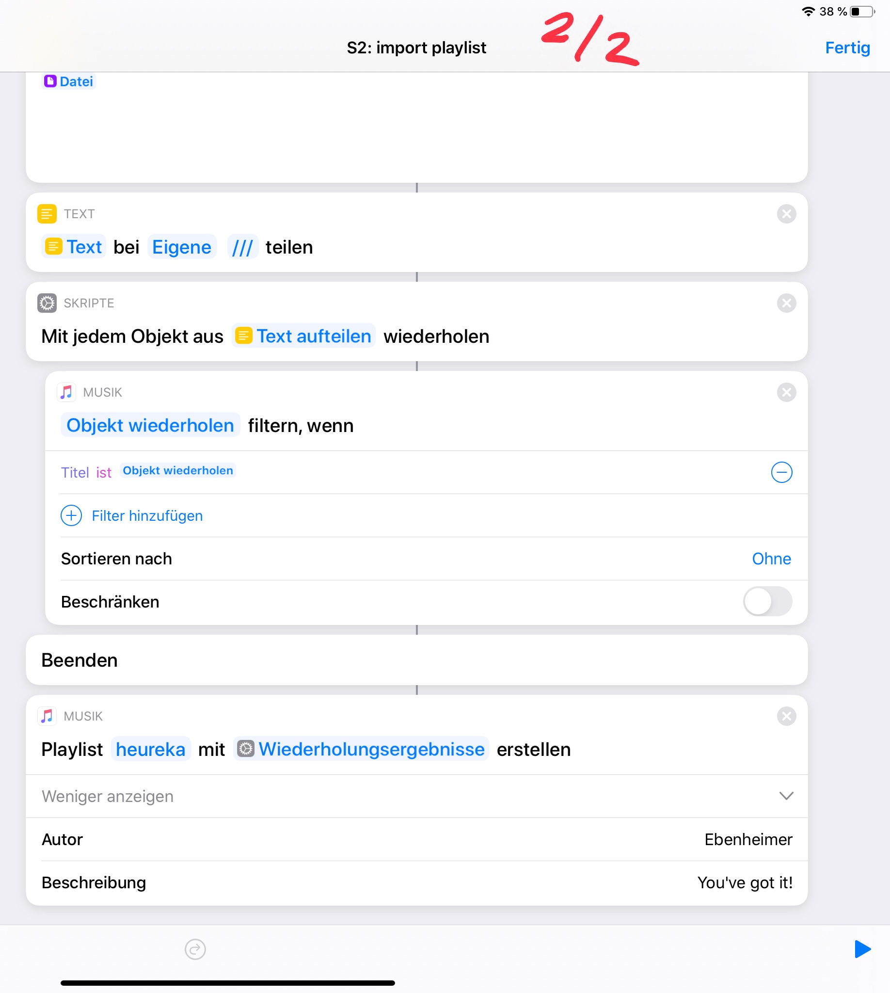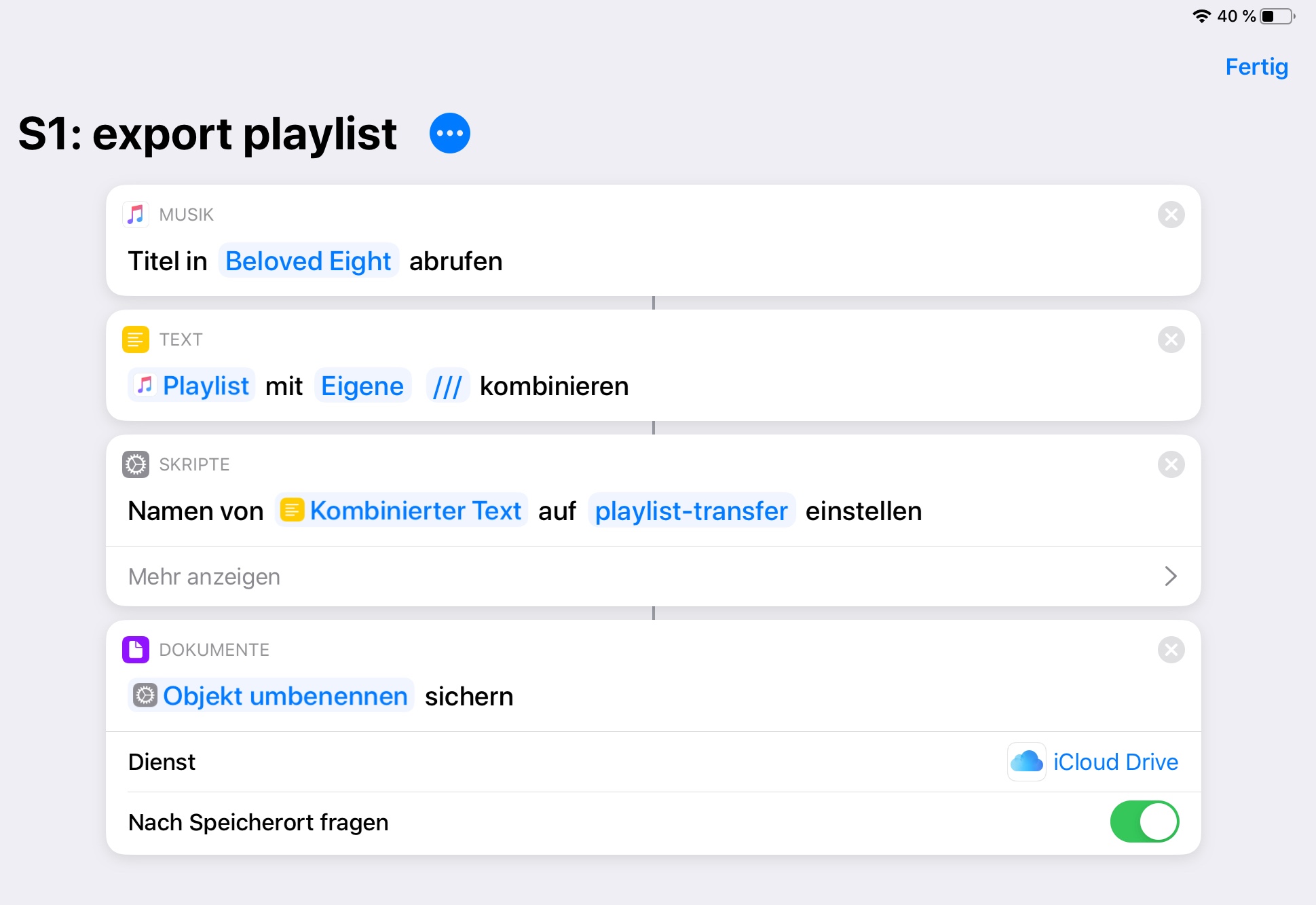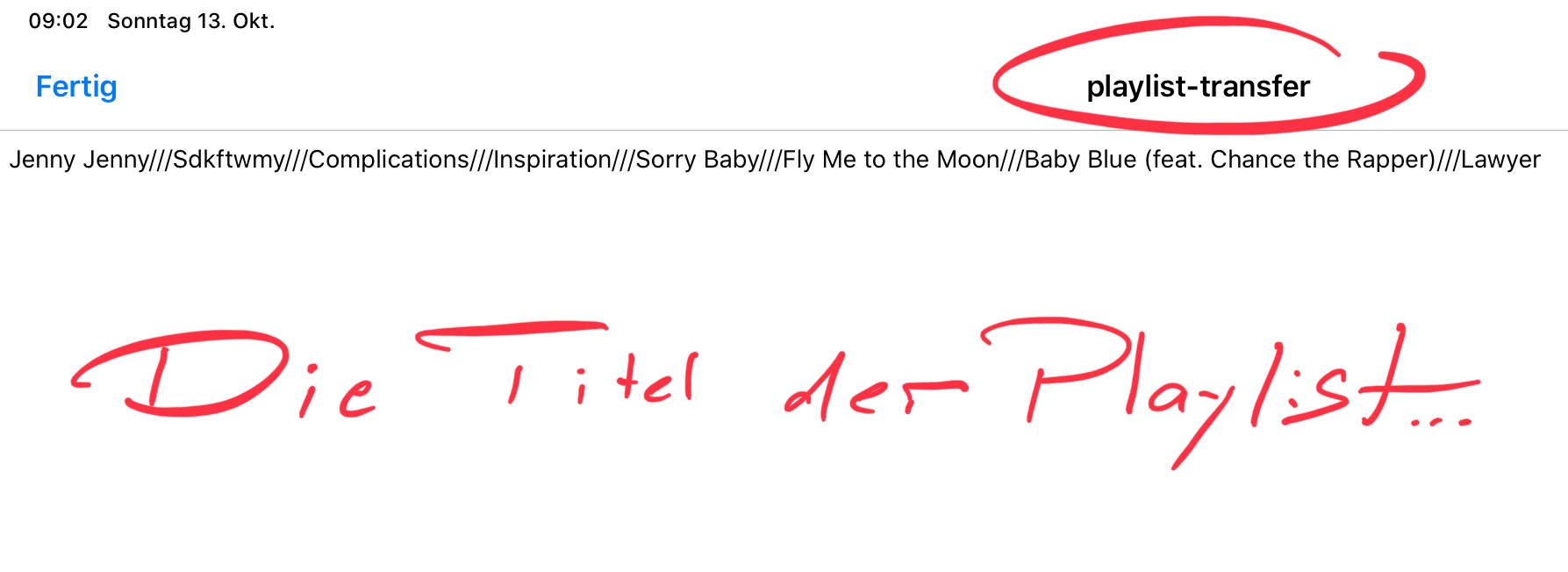 Denn wie lange man auch sucht, einen einfachen Weg (z.B. via ShareSheet und AirDrop) gibt es nicht. Ich habe jetzt versucht, mir eine „Playlist Transfer Machine“ mit Hilfe der Shortcuts (Kurzbefehle App) zu basteln, bin aber bislang gescheitert. Diverse Drittanbieter-Apps bieten Lösungen an. Das Ziel sollte aber sein, ohne diese auszukommen. Hat jemand Ideen?