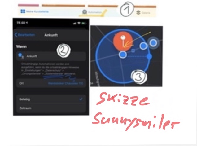 Ühttps://apps.apple.com/de/app/kurzbefehle/id1462947752kann kann man „Automation“(1) wählen, dort z.B. das Betreten eines festgelegten Bereiches(2) als Auslöser definieren ... und dann z.B. das Gerät vibrieren lassen. Hierdurch hätte wie hier erhofft ein lokal sensibler Alarm eingestellt werden können. In meinem Testlauf ist es jedoch an keinem der drei Punkte* zu einer Reaktion „vibrieren“ gekommen.