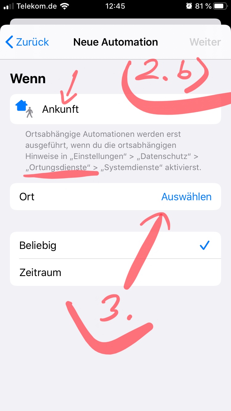 * Anmerkung Ebenheimer: Mit den „drei Punkten“ meint Sunnysmiler die Bildschirme, die beim erstellen der Shortcuts-Automation durchlaufen werden.