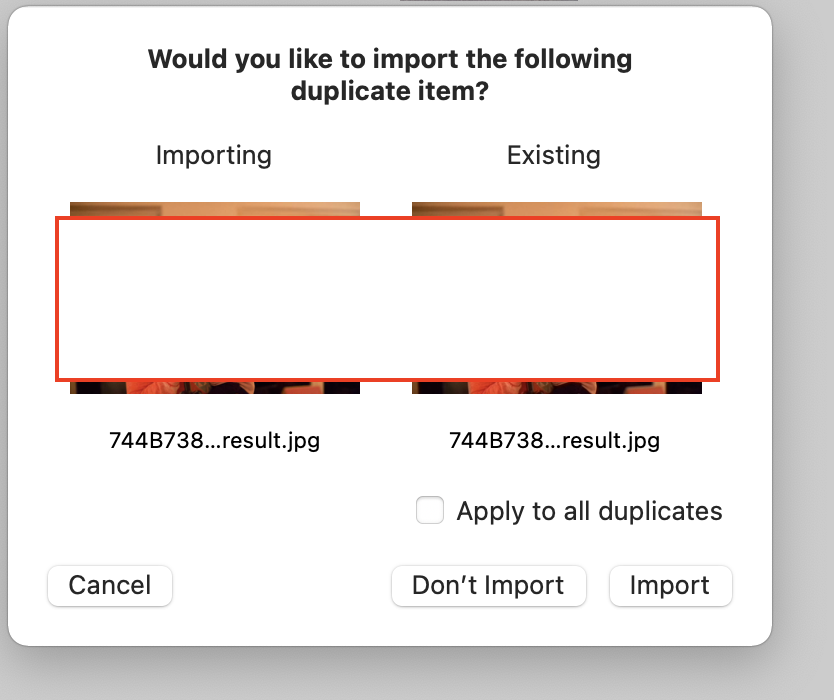 Duplikate werden beim Importieren von Fotos erkannt. Hier wirst du gefragt, ob du dieses Duplikat importieren willst.