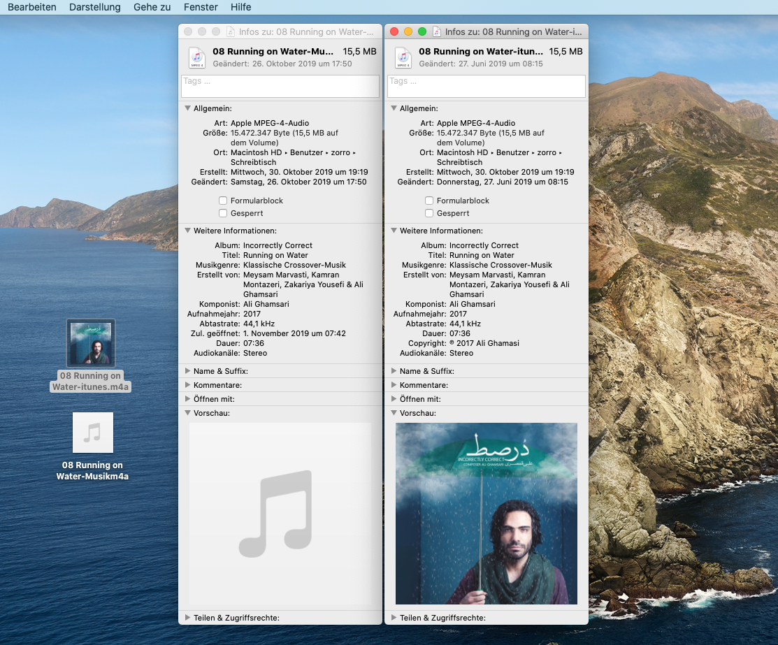 Wenn ich nun mit der Musik App die iTunes Match Musik herunterlade und mit meinen alten Musikdateien aus einem früheren Backup vergleiche, sehe ich auf dem Desktop bei den alten Dateien, das Cover, bei den neu heruntergeladenen nicht.