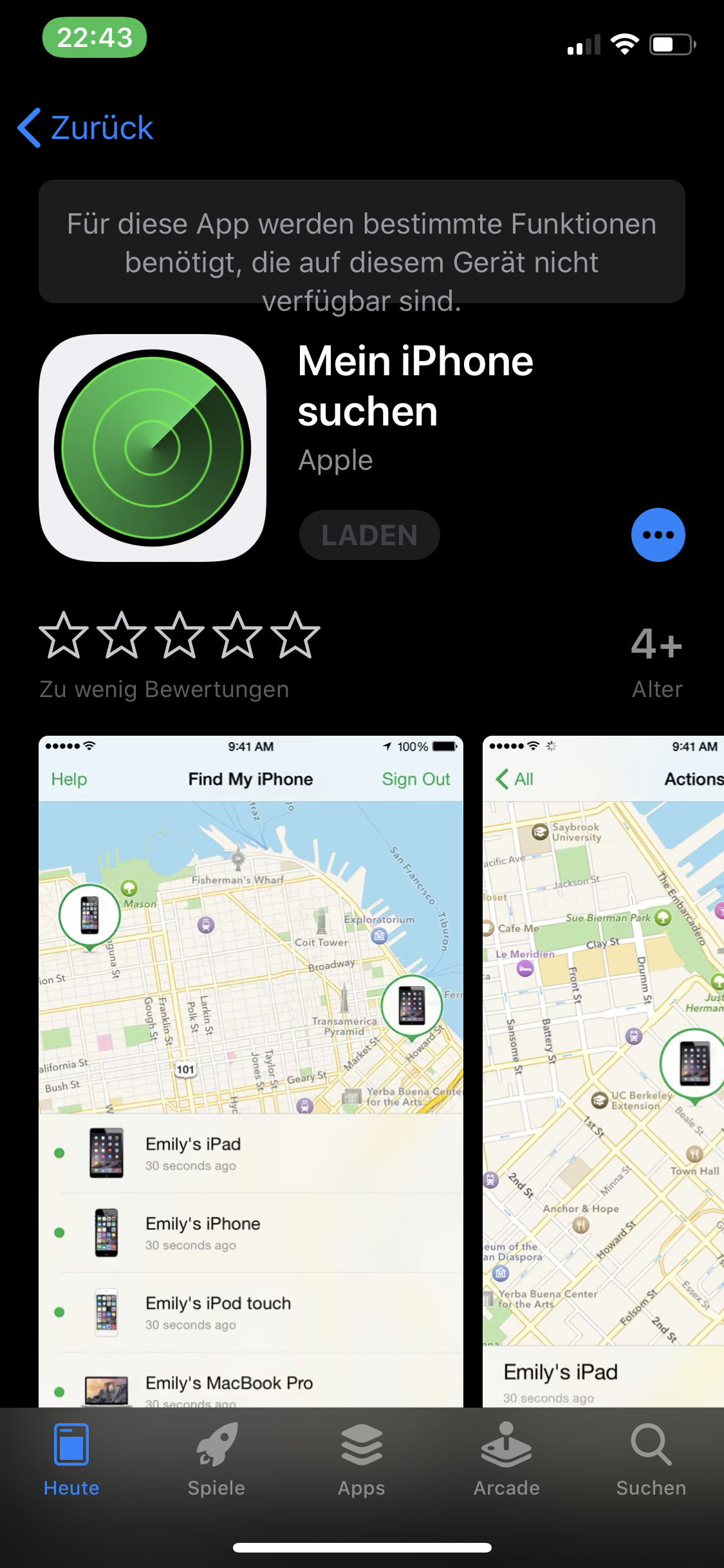 Ich finde die „Wo ist“ App im AppStore gar nicht.. wenn ich „meine Freunde suchen“ genauso wie „mein iPhone suchen“ suche kommt nur die meldung: für diese App werden bestimmte Funktionen benötigt, die auf diesem Gerät nicht verfügbar sind.