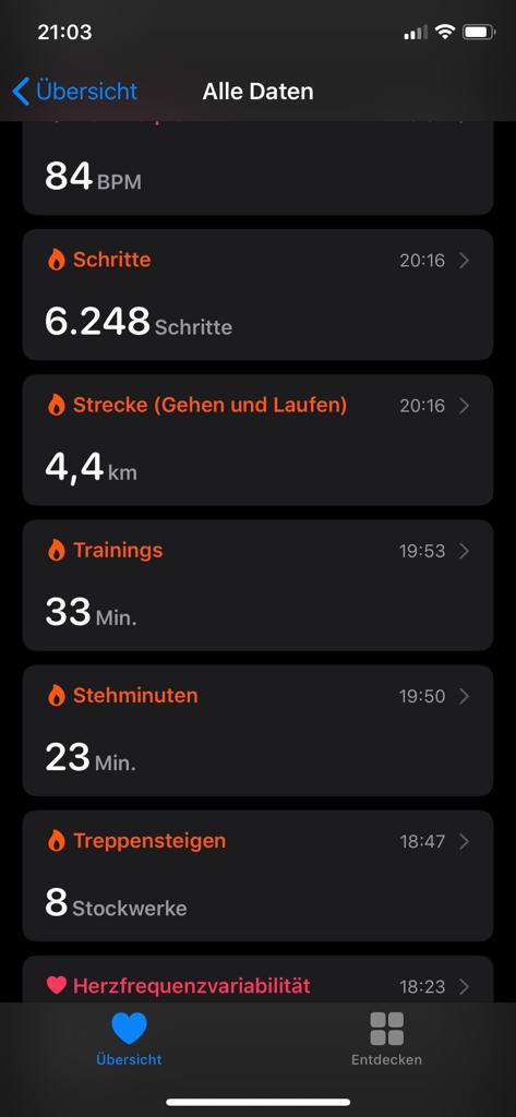Nun hat sie einige Workouts gestartet (Gesamtzeit ~33min), aber der grüne Trainingsring zeigt nur 6 Minuten an. An dem Diagram sieht man aber passend zur der Uhrzeit einen Ausschlag.