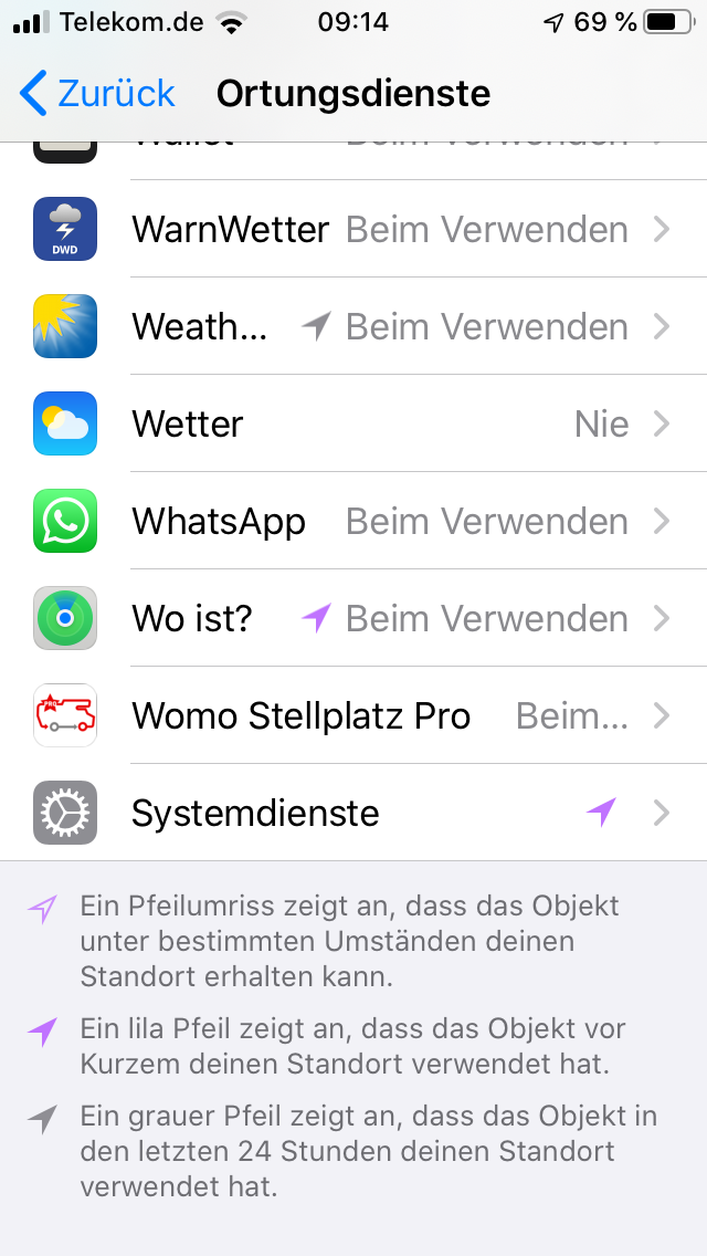 Ich habe die App "Wo ist" gerade eben benutzt, daher der lila Pfeil in der Liste und der Pfeilumriss in der Statusleiste, der aber nur kurz angezeigt wird, und nach der Benutzung der App wieder verschwindet.