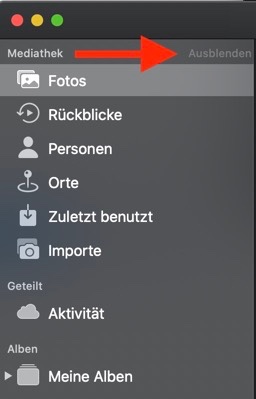Rechts vom Wort "Mediathek" in der Seitenleiste gibt es einen verborgenen Text "EInblenden/Ausblenden", der nur sichtbar wird, wenn man den Zeiger darüberbewegt.