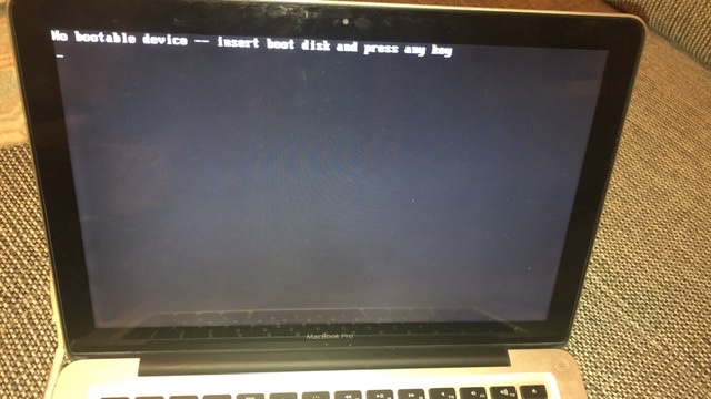 Ich habe mit dem BootCamp Assistenten eine Partition auf meinem MacBook Pro erstellt. Das hat auch alles wunderbar funktioniert. Bis alles fertig war, der Bildschirm schwarz wurde und die untenstehende Fehlermeldung auftauchte: No bootable device - Insert Boot disk and press any key.