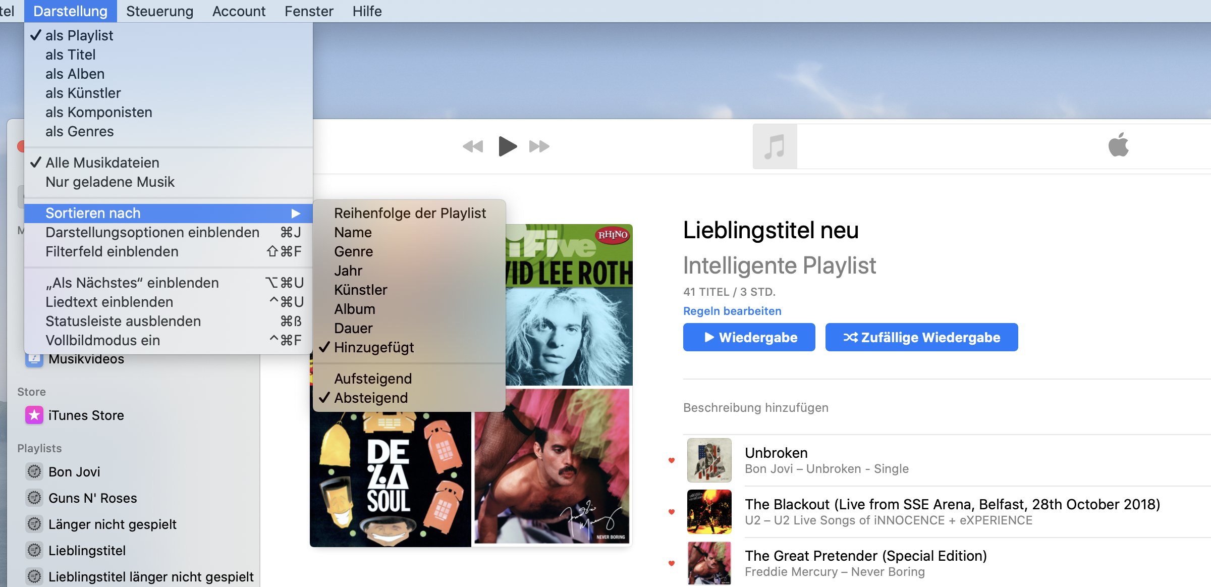 Ich habe diverse intelligente Playlisten in der Mac Musik App, die meistens nach Darstellung Playlist aufsteigend sortiert nach Künstler sind.