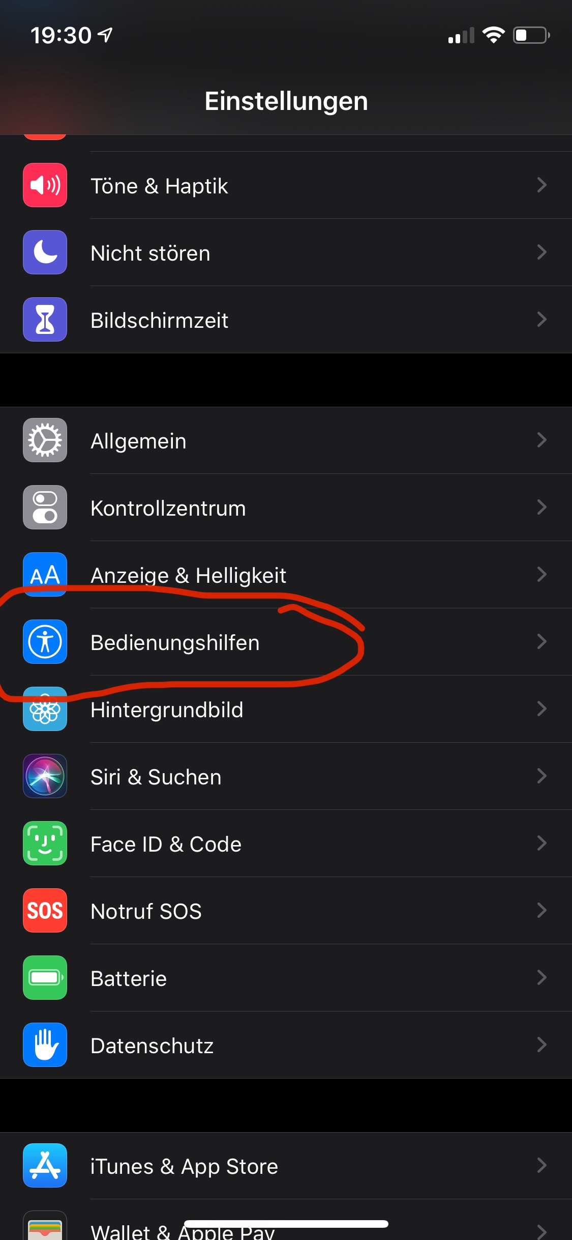 Bei mir befindet sich der Menüpunkt Bedienungshilfe jedoch einfach in den Einstellungen zwischen „Anzeige & Helligkeit“ und „Hintergrundbild“. Siehe auch den beigefügten Screenshot.