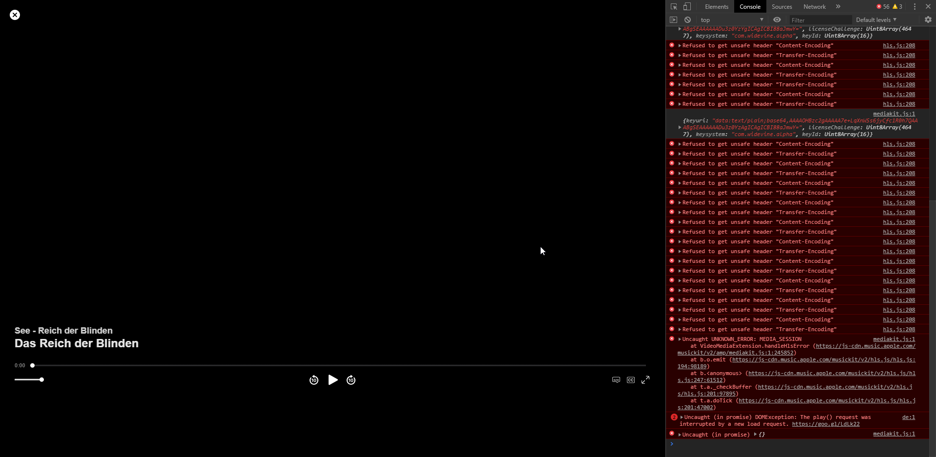 Auch über den Edge Browser lässt sich der Stream nicht starten. Auch hier bekomme ich in der Browser-Konsole Fehler - Darüber hinaus ist das Play-Menü vom Stream mit "Play-Pause", "Vor-Zurück" mittig zentriert.