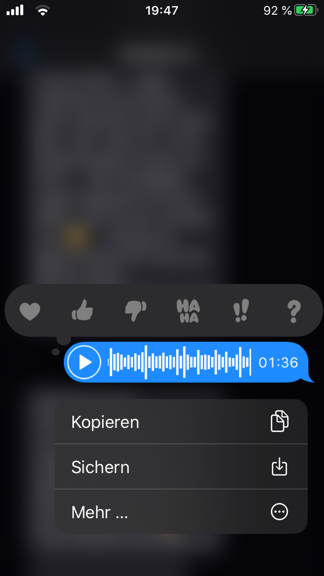 In iMessage kann man auf die Sprachnachricht drücken und es erscheint ein Menü mit den Punkten „Kopieren“, „Sichern“ und „mehr“. Wohin werden die Nachrichten denn gesichert? Ich finde weder unter Sprachmemos noch sonst wo etwas wieder.