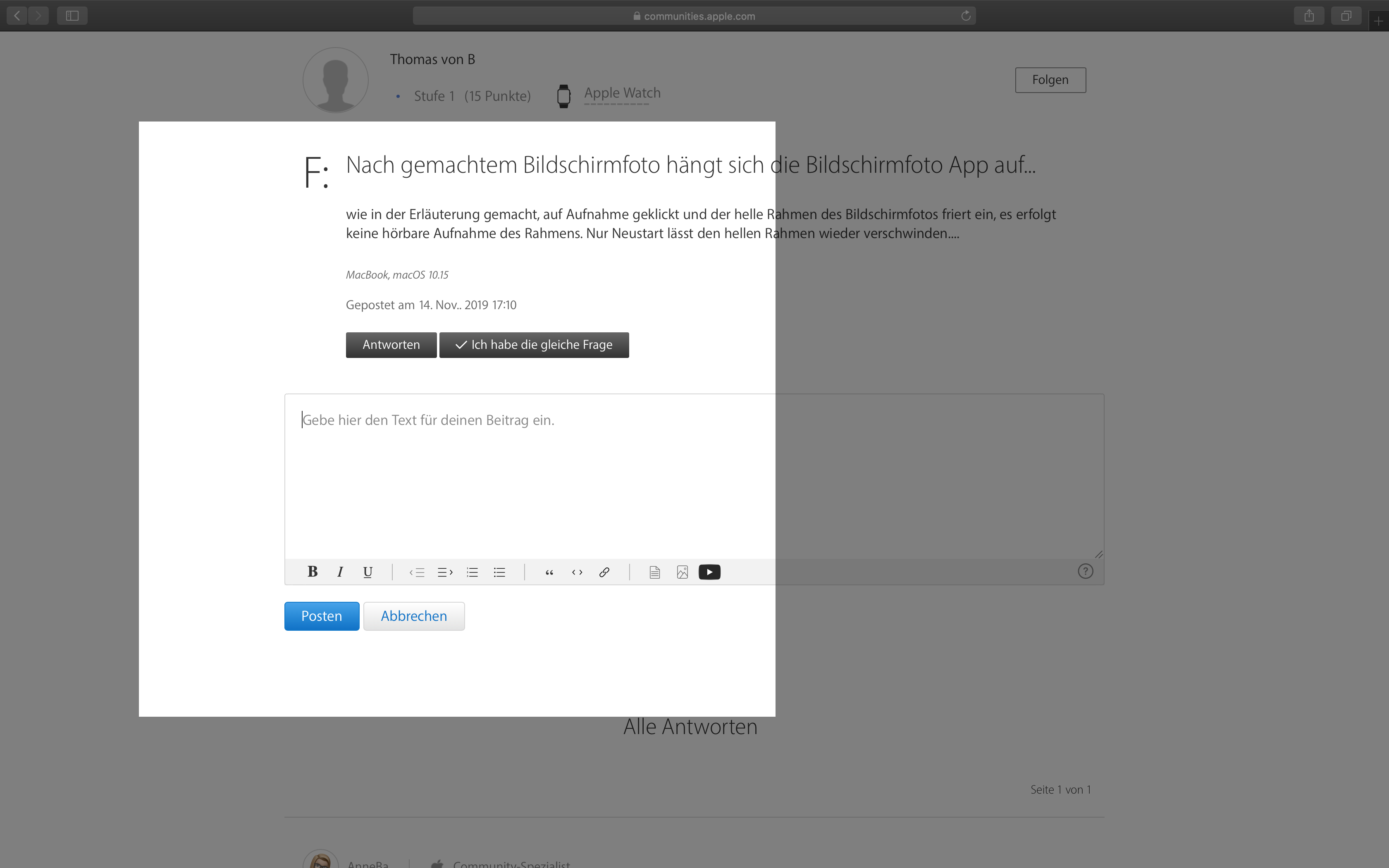 Wenn ich die Tastenkombinationen nutze (command,Shift + 3 oder 4) funktioniert die Aufnahme tadellos. Wenn ich Command, Shirt + 5 nutze kommt es wieder zum Absturz.