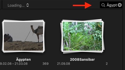 Ein neuer Morgen, und das "loading" ist noch nicht beendet. Aber ganz oben über den Alben ist ein Suchfeld. Wenn ich dort den Namen eines Albums eingebe, wird dieses Album anzeigt. Man könnte ale Fotos, die man in iMOvie verwenden will, kurzfristig in Fotos in einem Album "für imovie" zusammenfassen, bevor man iMovie öffnet und dann "imovie" ins Suchfeld eingeben. HIer suche ich beispielsweise nach meinem Album "Ägypten".