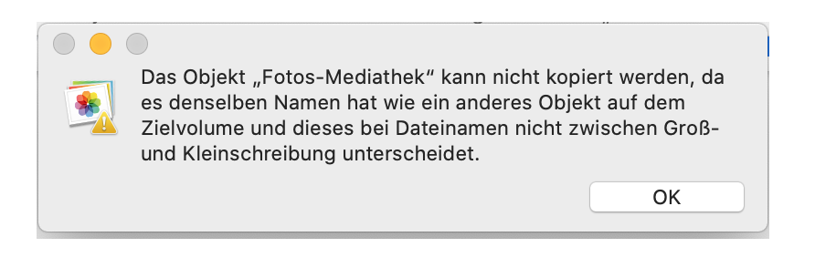 nachdem ca 91GB von 116GB kopiert wurden, kommt die Fehlermeldung, das die Mediathek nicht kopiert werden kann, da sich auf dem Laufwerk ein Objekt mit dem selben Namen befindet. Mehr als ok klicken kann ich nicht und dann wird der Kopiervorgang abgebrochen (siehe Foto).