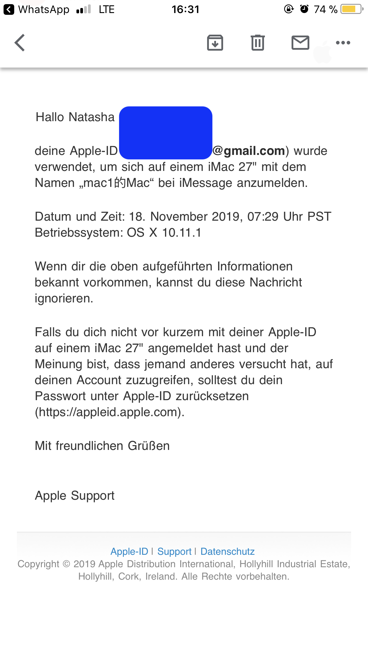 Hallo, ich bekam heute diese E-Mail ich habe mich nicht auf einem iMac27 angemeldet ich habe unverzüglich mein Passwort geändert heißt das dass die Person die sich mit meinen Daten sich angemeldet hat automatisch auf dem Gerät abgemeldet wird?