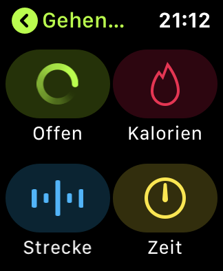 Bei "Zeit" kommt die gelbe Anzeige, bzw. rot bei "Kalorien", blauer Ring "Strecke".