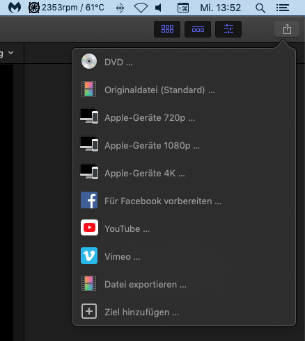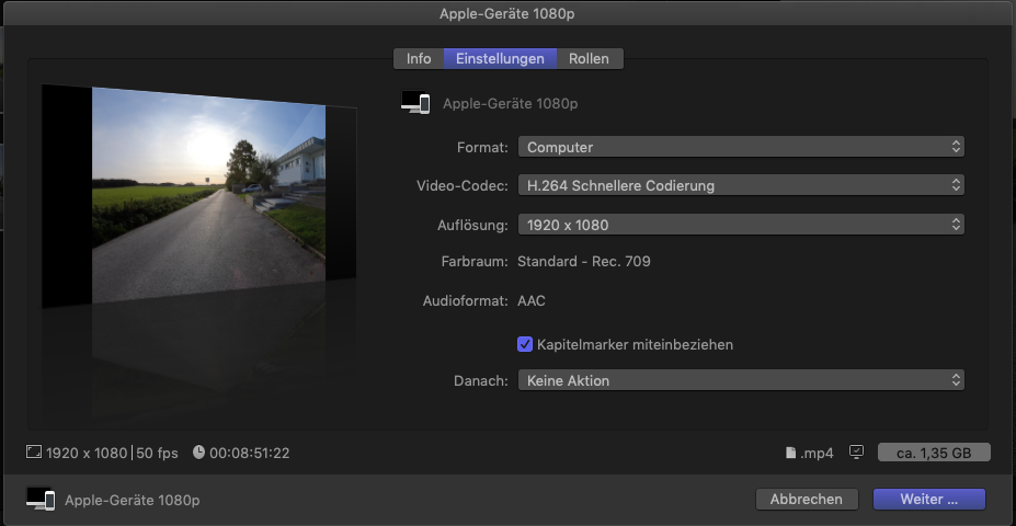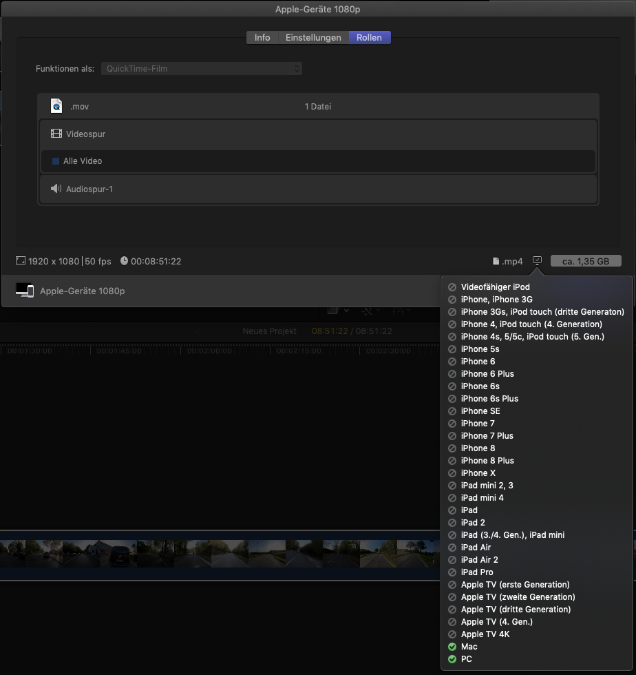 Ich bin der Meinung, dass ich in der Vergangenheit alle Filme gleich erstellt habe, d. h., ich bin bei Final Cut auf "Originaldatei" und habe dann die Einstellung Video-Codes: "Apple ProRes 422 HQ" gewählt. Die Filme haben dann als Endung" .mov".