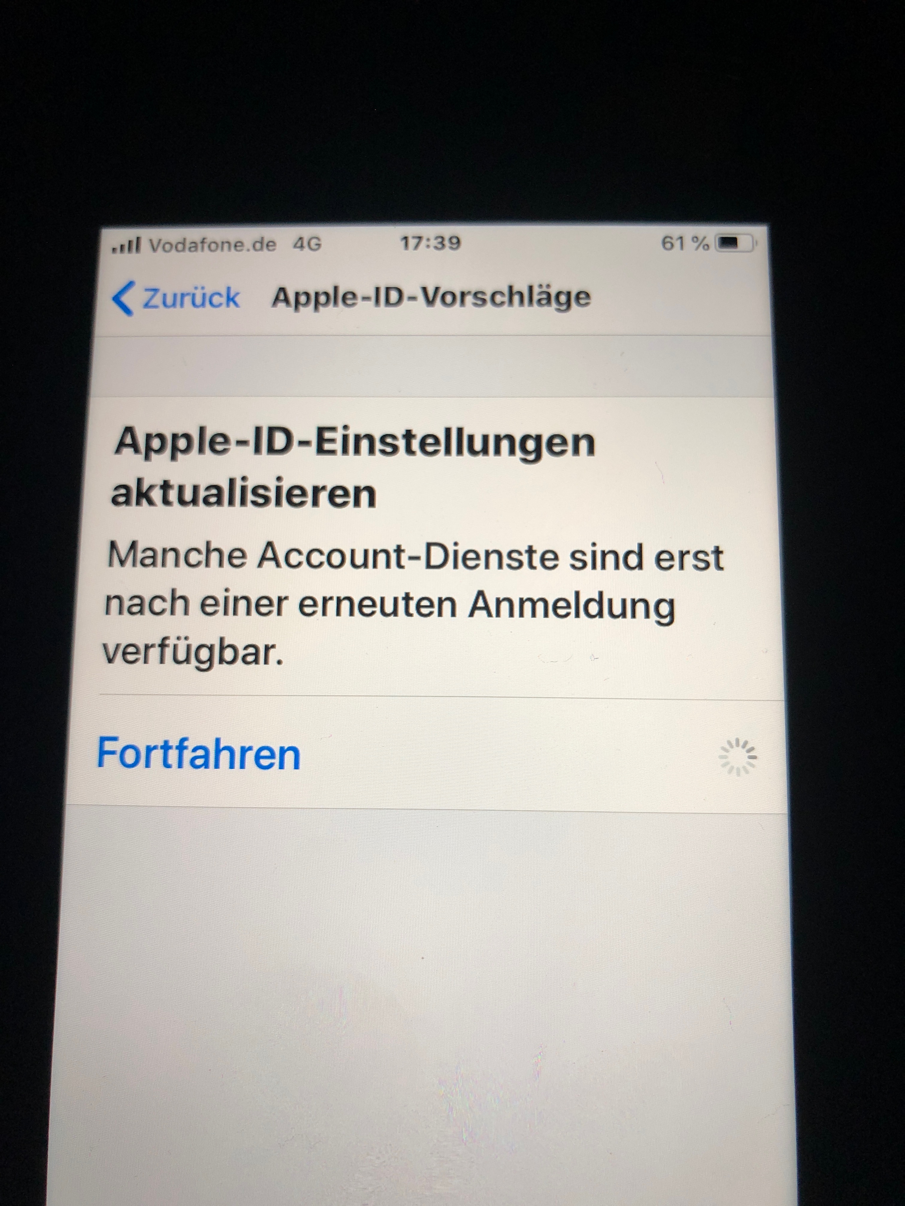 Hallo, wir mussten mein altes IPhone 7 neu anmelden, jetzt bin ich auf meiner Apple ID angemeldet, habe allerdings immer noch die Meldung „das manche Account-Dienste erst nach erneuter Anmeldung verfügbar sind“. Dann kann ich auf fortfahren drücken und komme ich nicht weiter als: