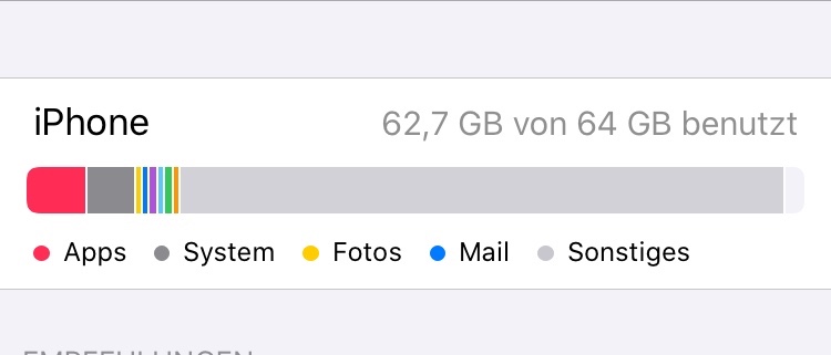ich bin echt am verzweifeln. Mein iPhone 6s zeigt mir immer vollen Speicher an obwohl ich fast nichts mehr an Apps oder ähnlichem drauf habe. Habe schon einiges gelöscht. Was kann ich da machen, es ist echt nervig wenn man nicht mal mehr eine WhatsApp schicken kann, weil angeblich der Speicher voll ist. Kann mir jemand sagen was das sonstige ist? Anbei ein Bild. Vielen Dank für Euere Tipps :)