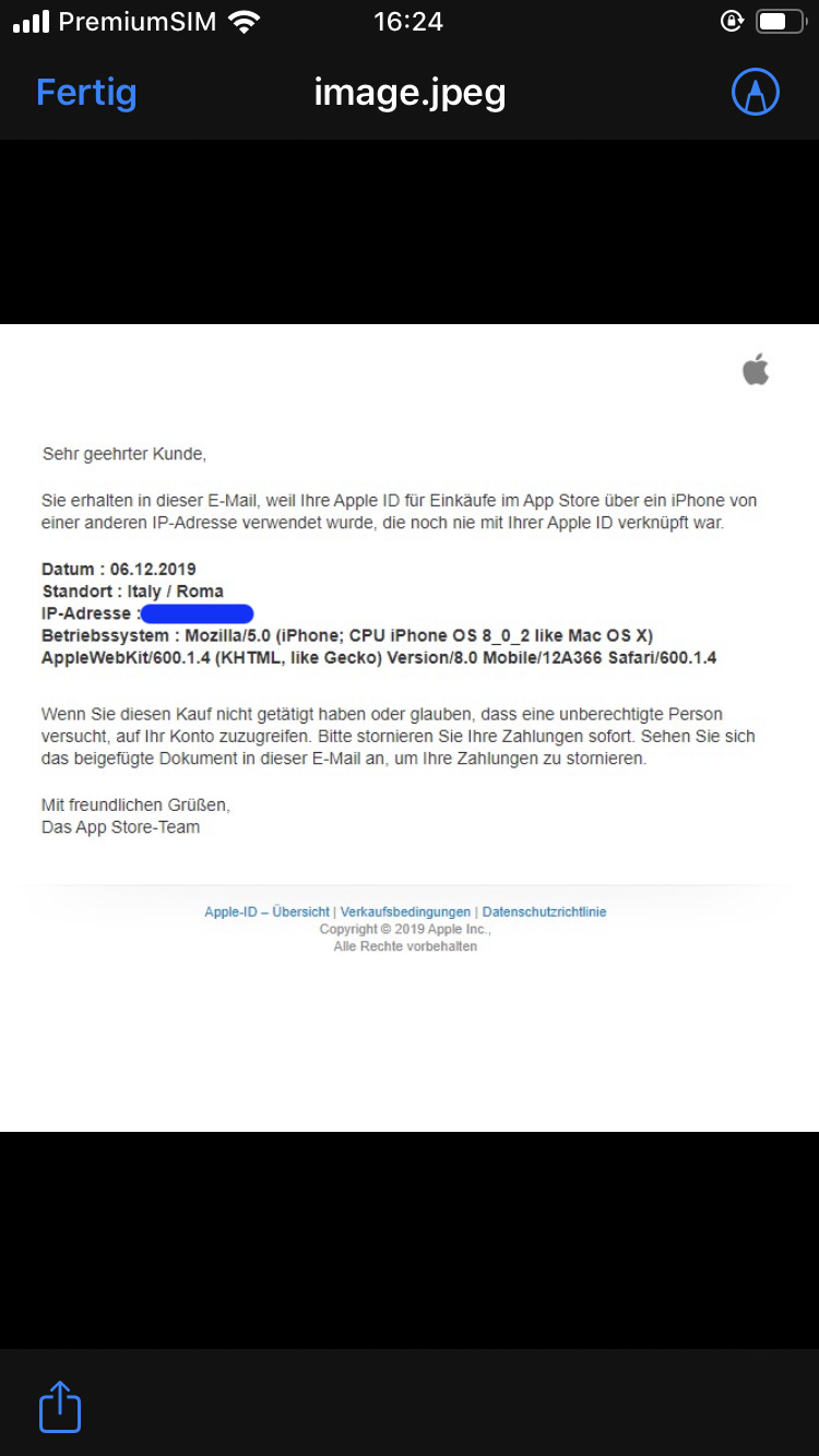 Guten Tag, habe heute eine email bekommen dort steht. Das meine Apple-ID für Einkäufe im App Store über ein iPhone von einer anderen IP- Adresse verwendet wurde. Standort italy/Roma